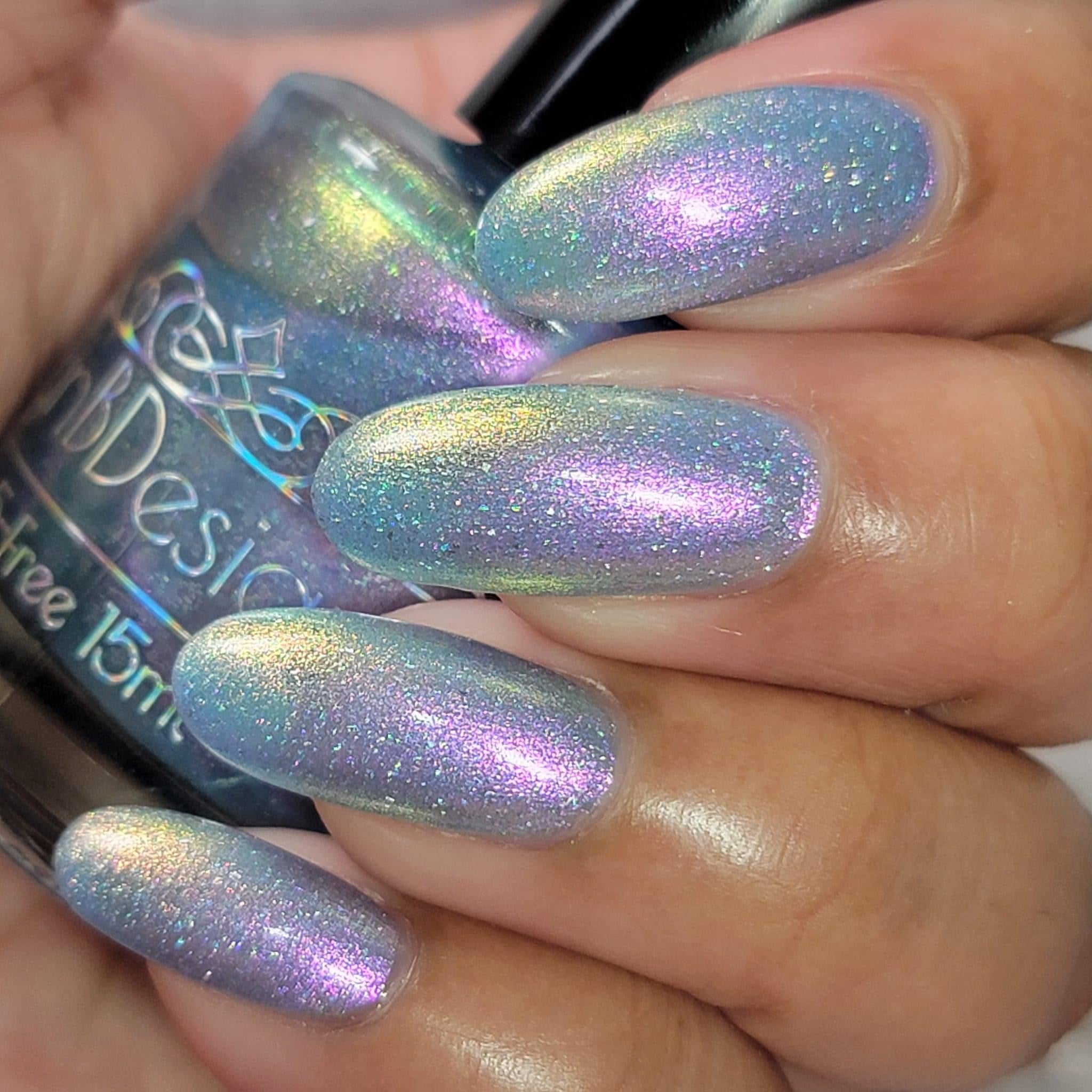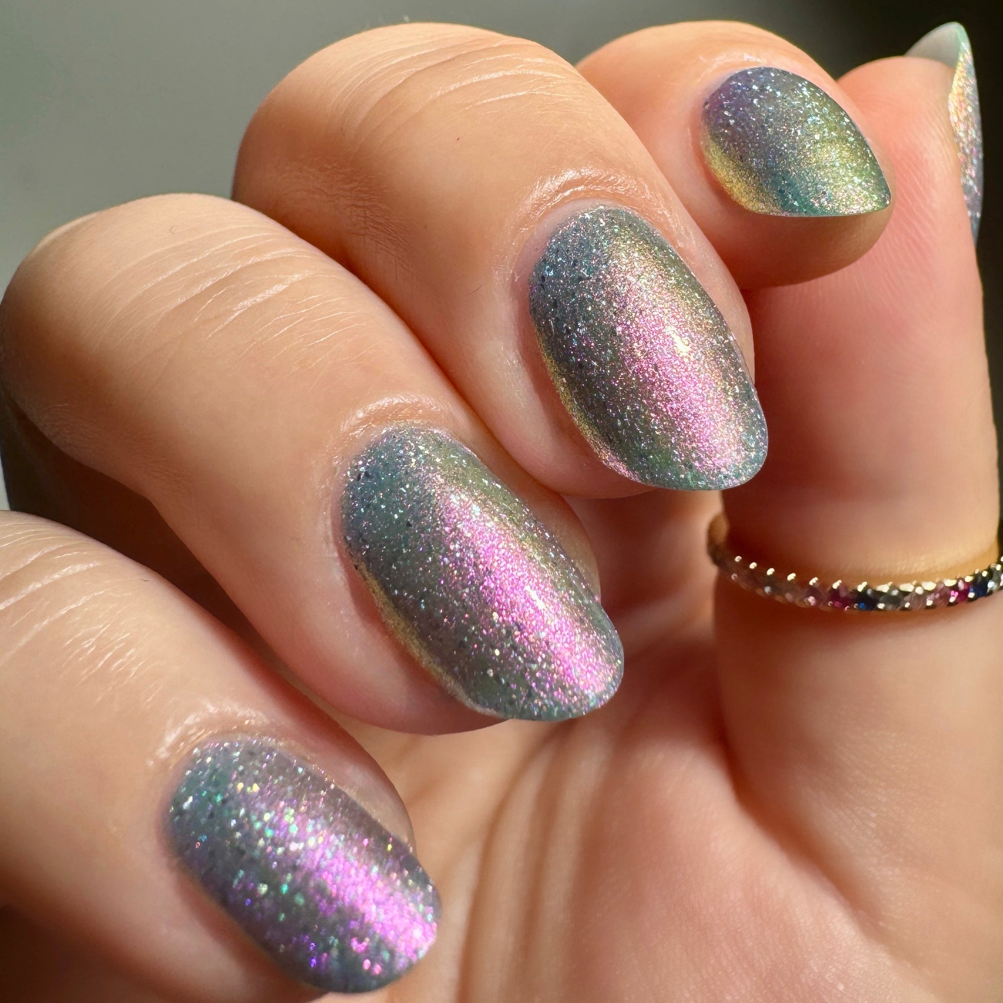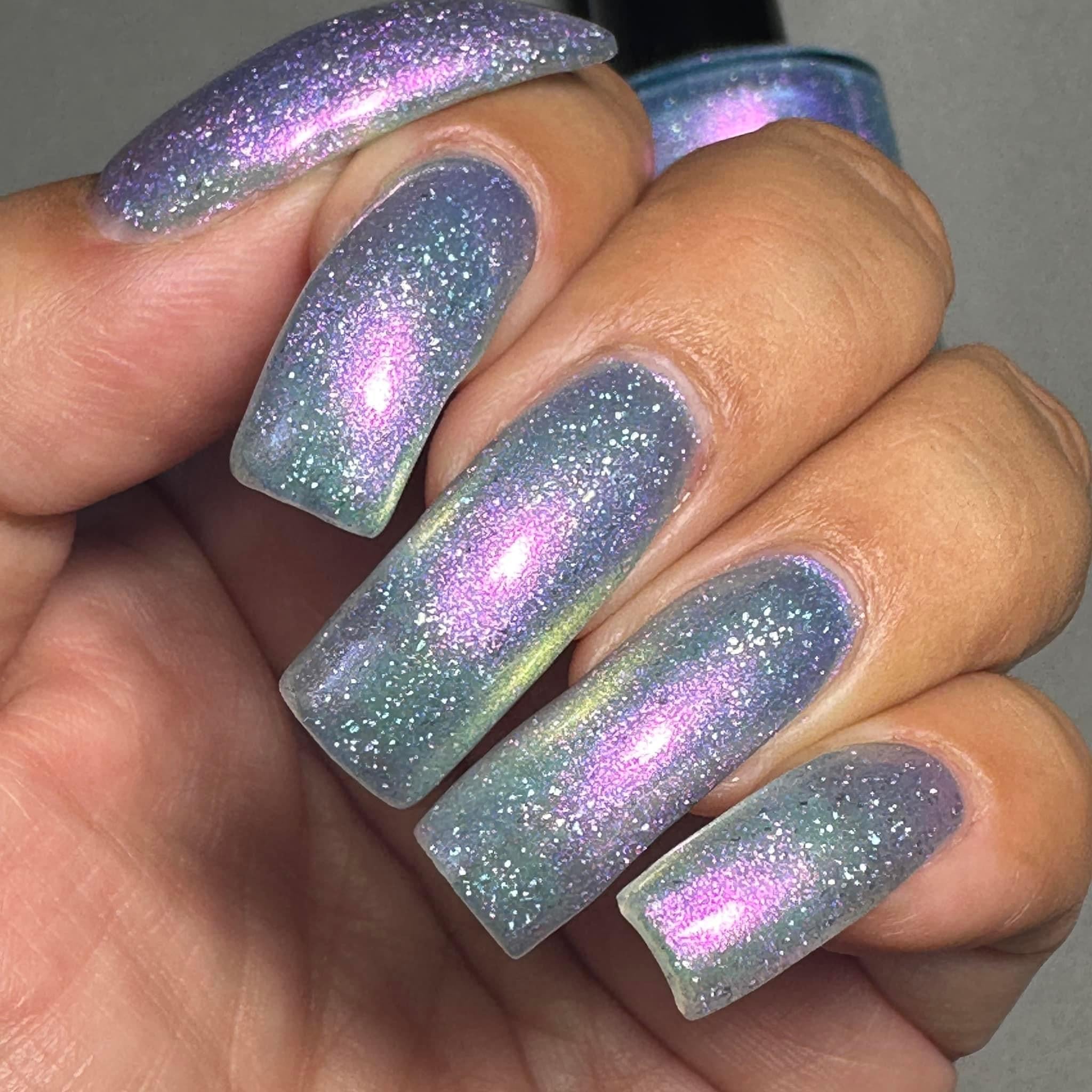 Mystic Haze- pale blue base with pink to gold to green to blue shifting shimmer and added holo flakies