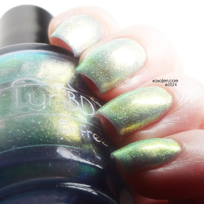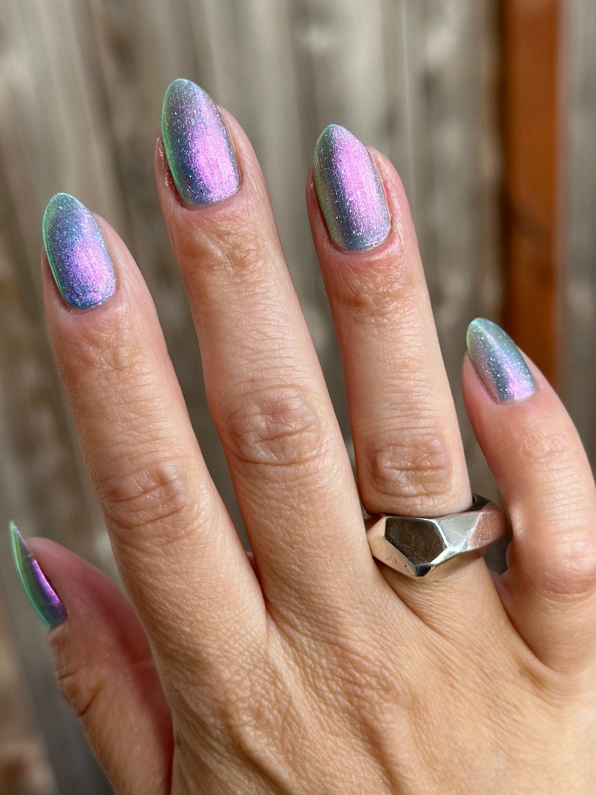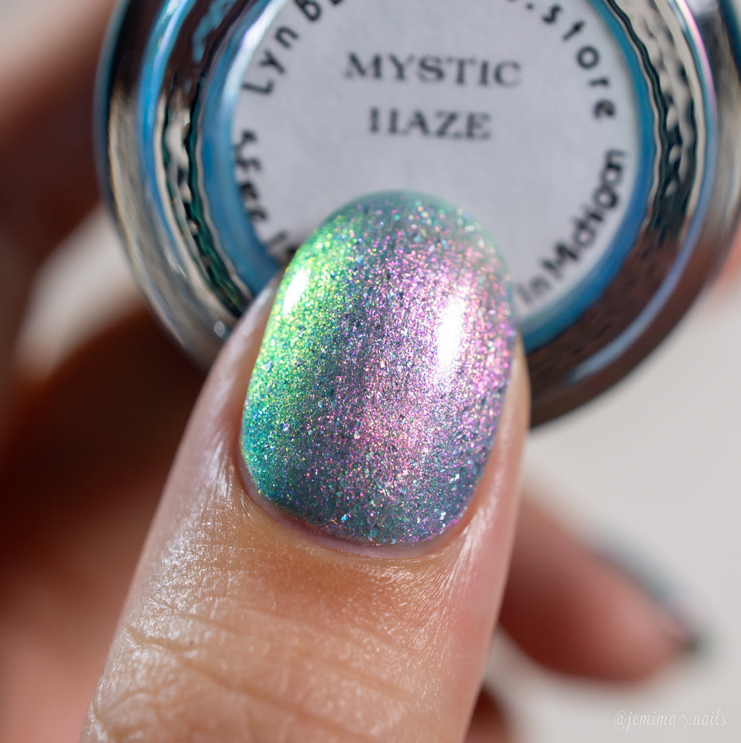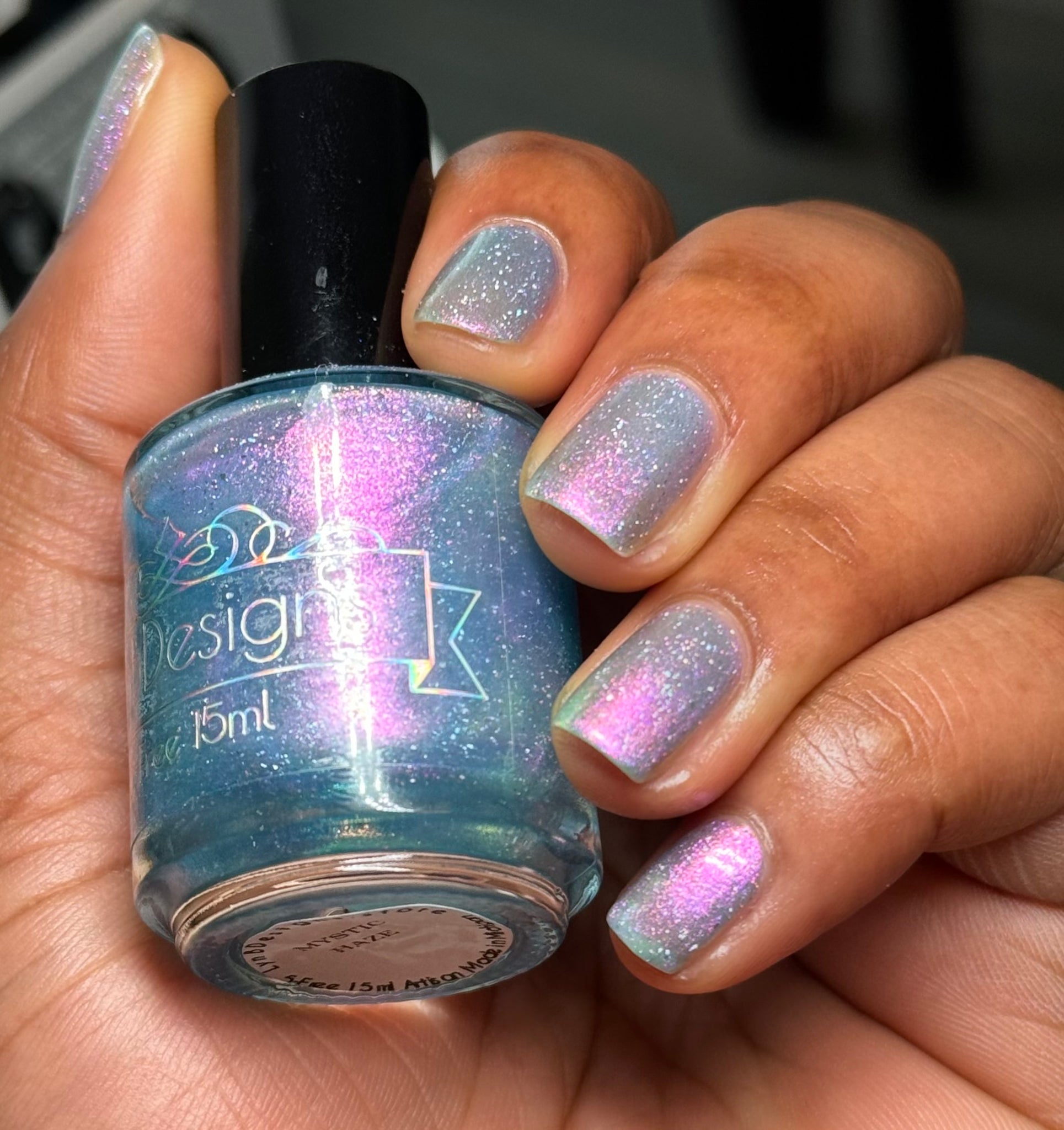 Mystic Haze- pale blue base with pink to gold to green to blue shifting shimmer and added holo flakies