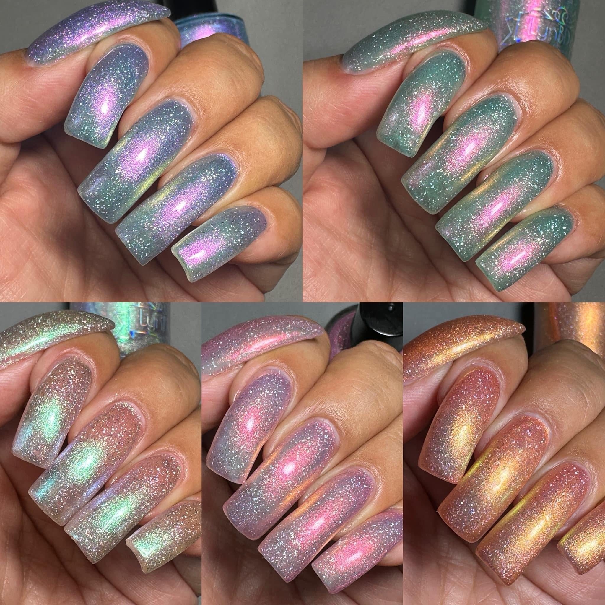 Cosmic Whisper- pale warm purple base with green to blue to purple shifting shimmer and added holo flakies