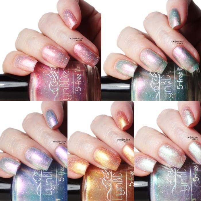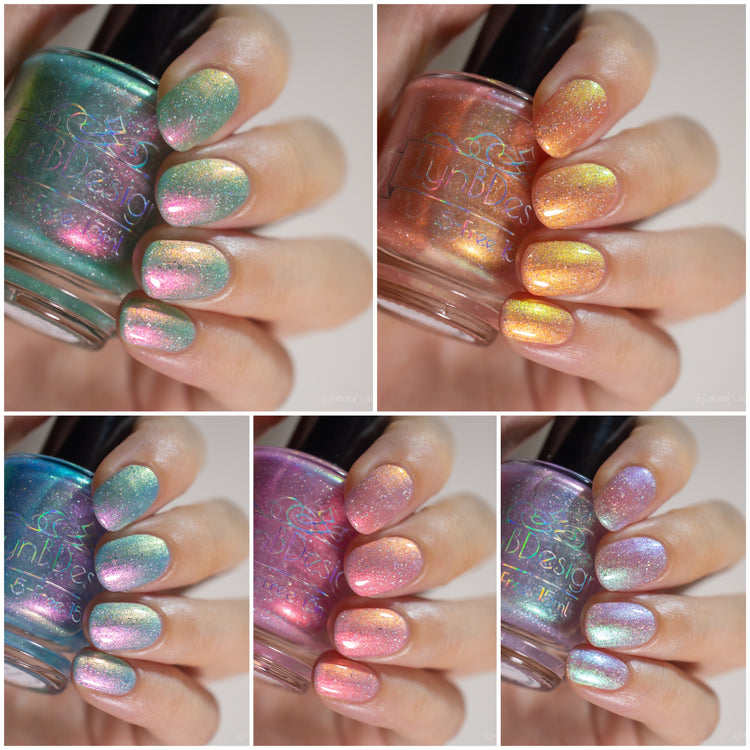 Mystic Haze- pale blue base with pink to gold to green to blue shifting shimmer and added holo flakies