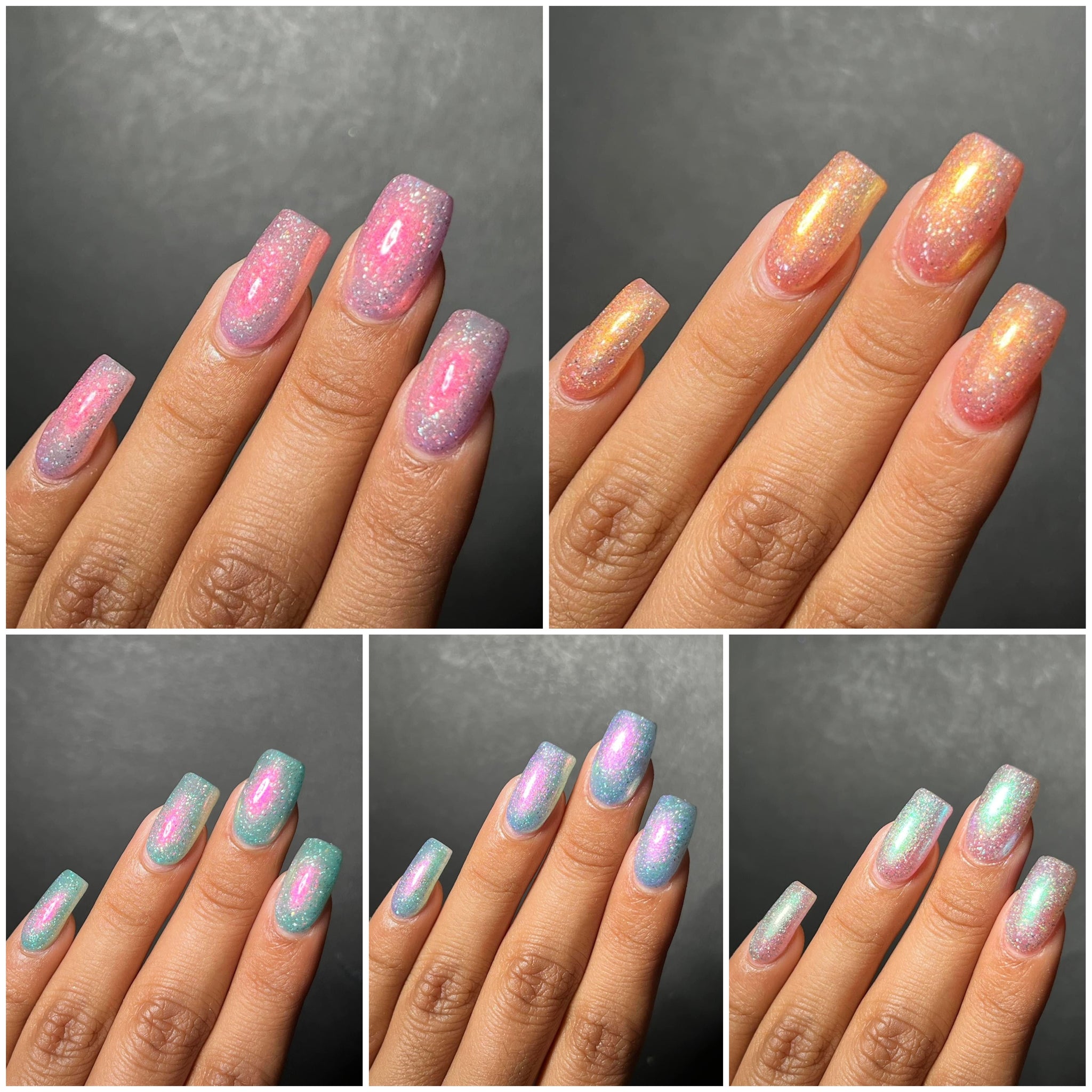 Luminous Dream- pale peach base with orange to gold to green shifting shimmer and added holo flakies