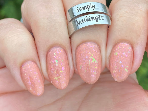 Scarf n Barfer- muted peach base filled with purple to pink shifting flakies and scattered green to blue shifting flakies