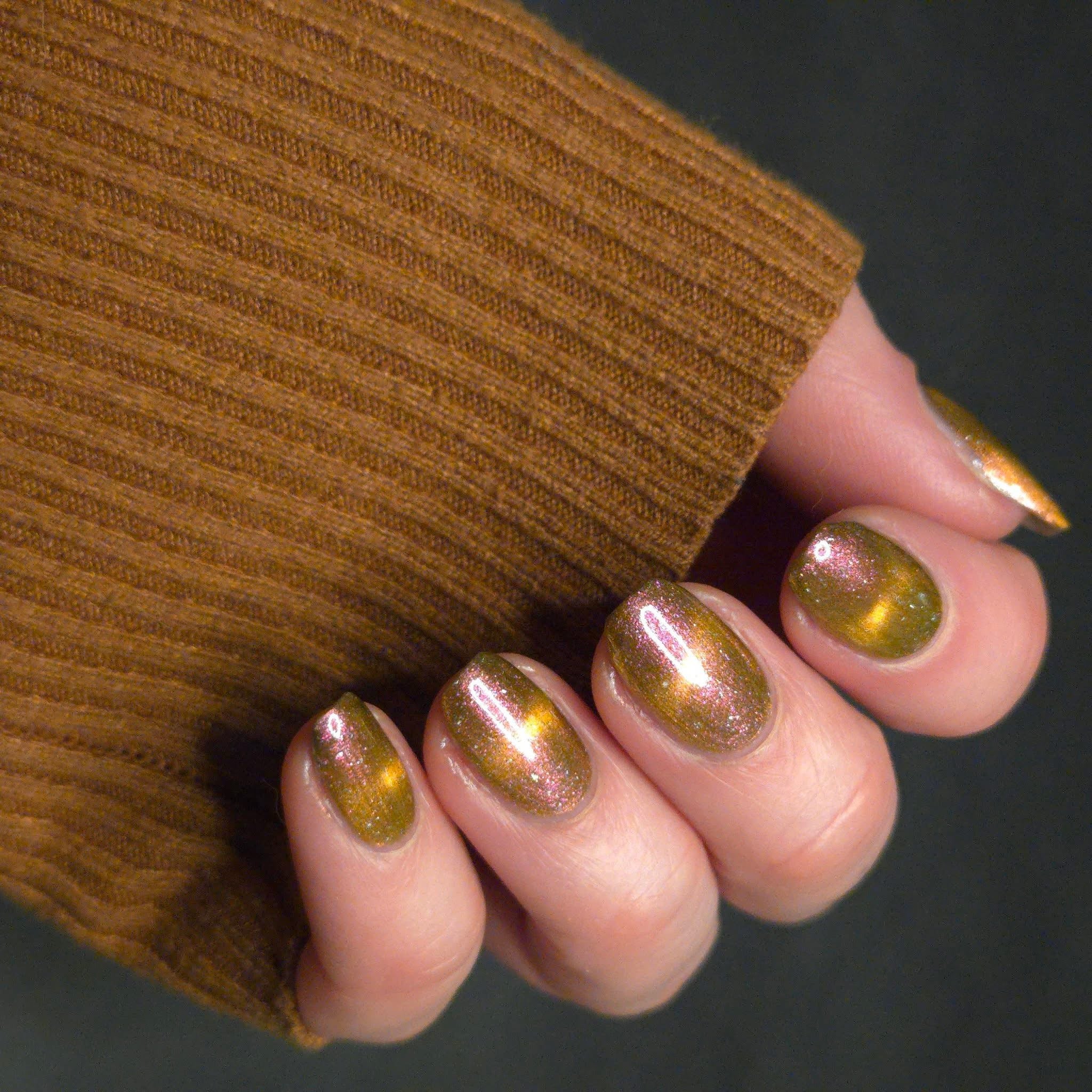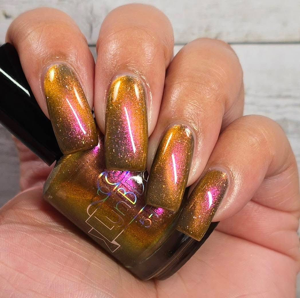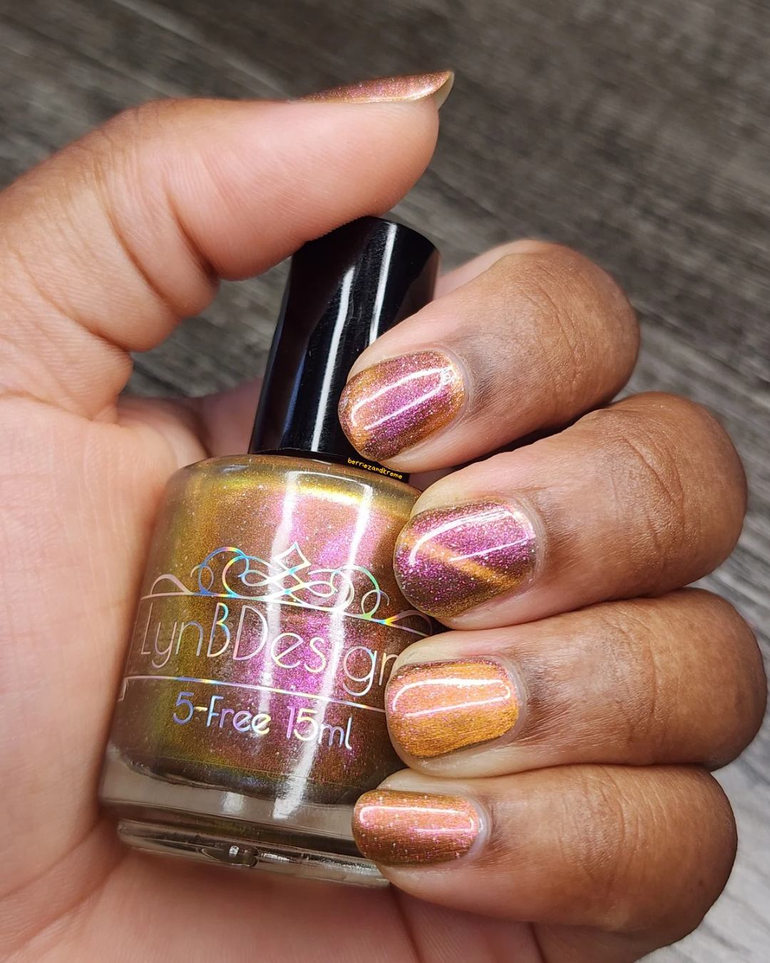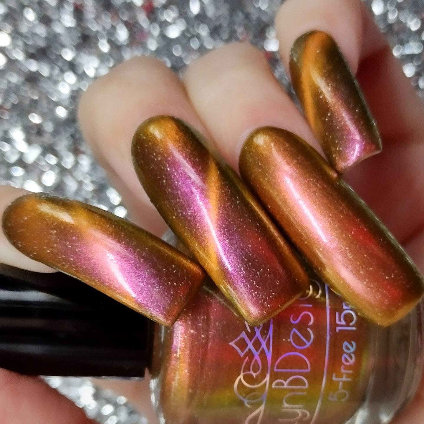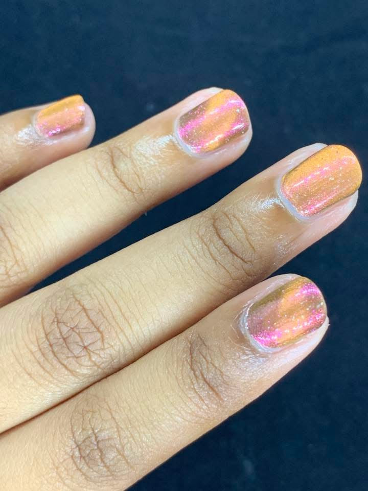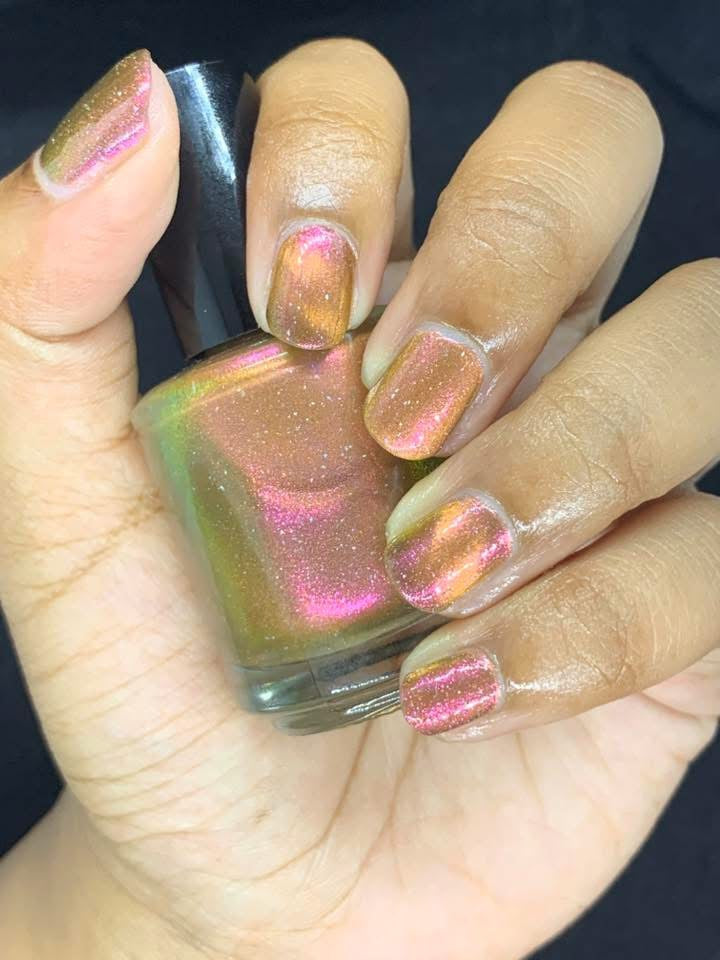Iconography- magnetic base with copper pull filled with pink to orange shifting shimmer and added holo flakies