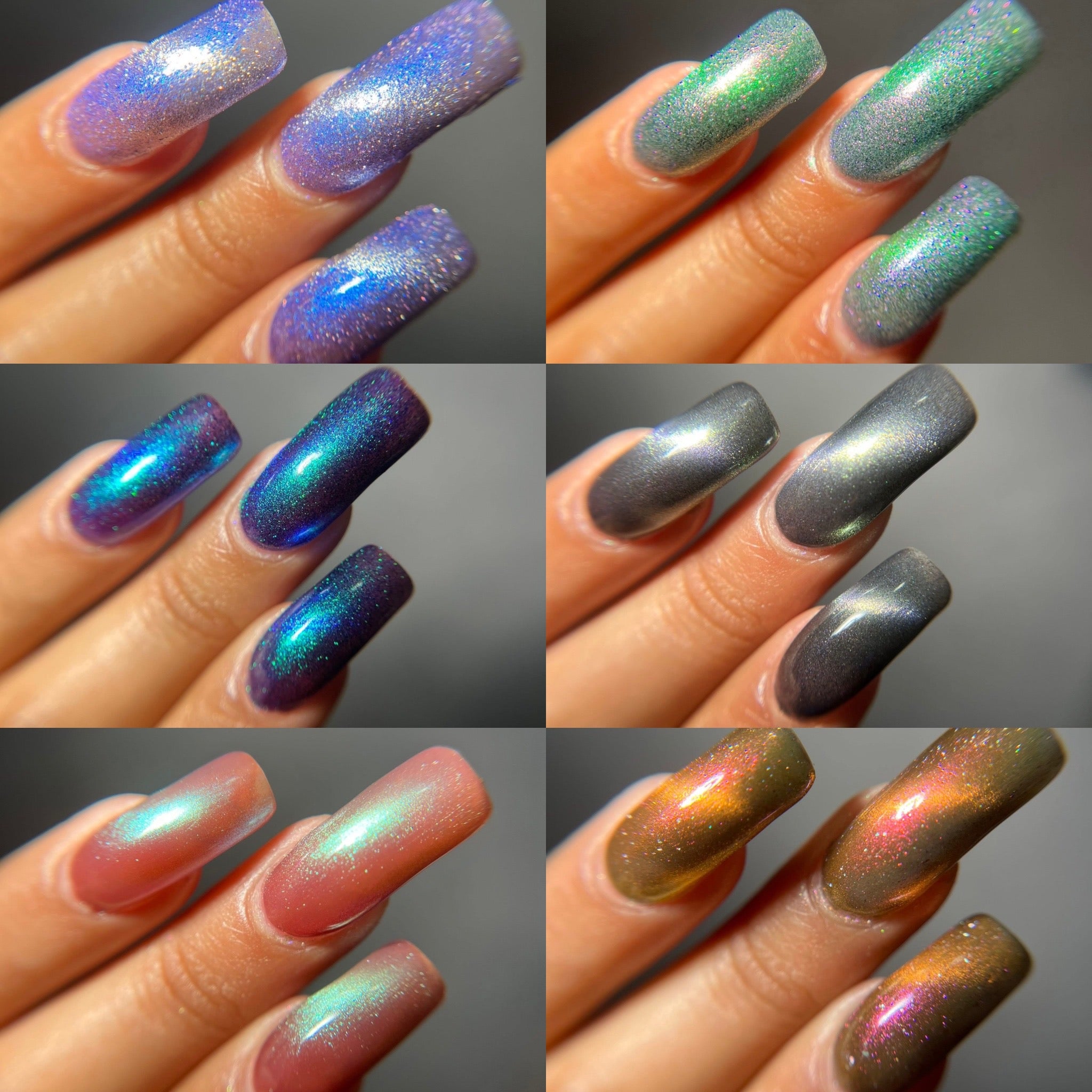 Caricature- stormy berry purple base with green to blue shifting shimmer and indigo magnetic pull