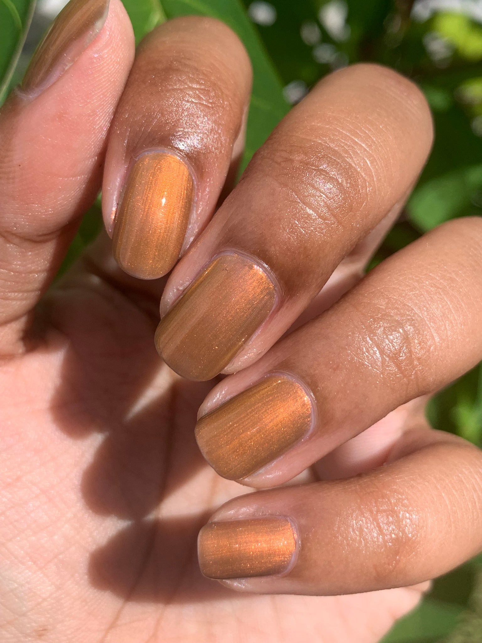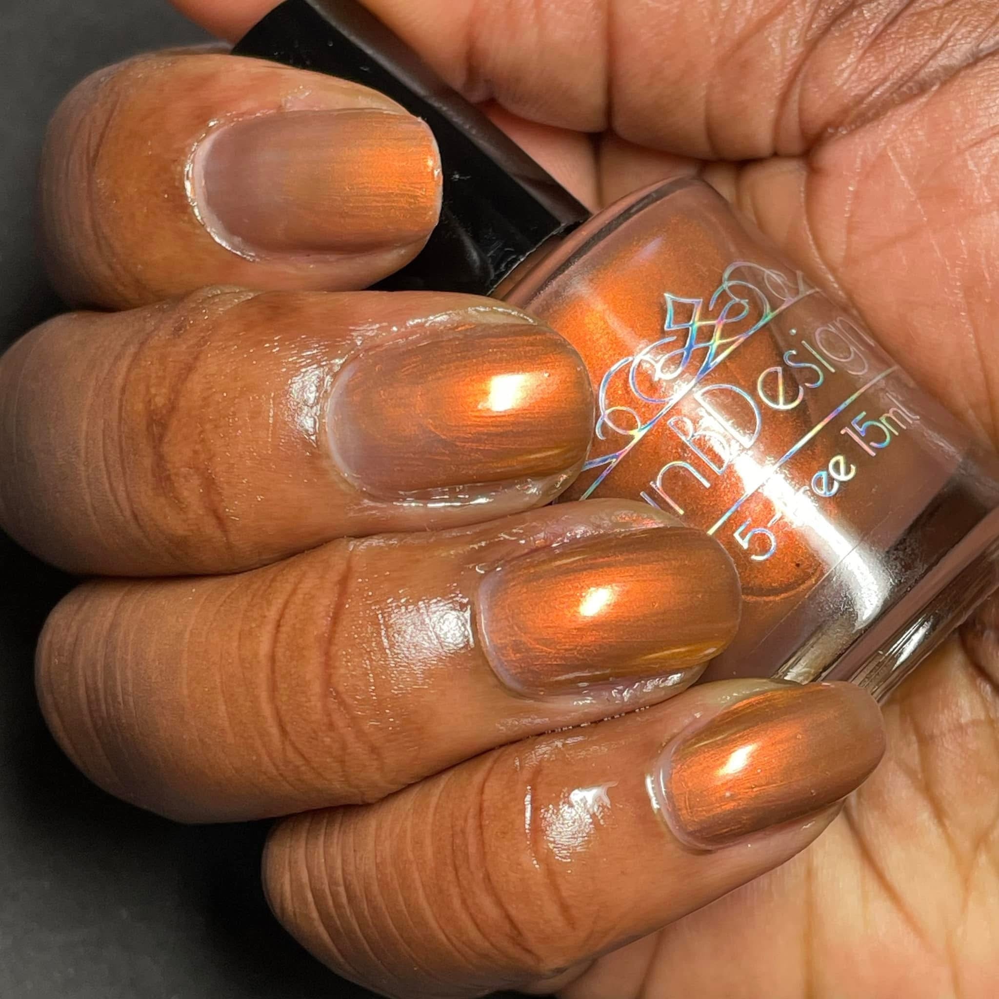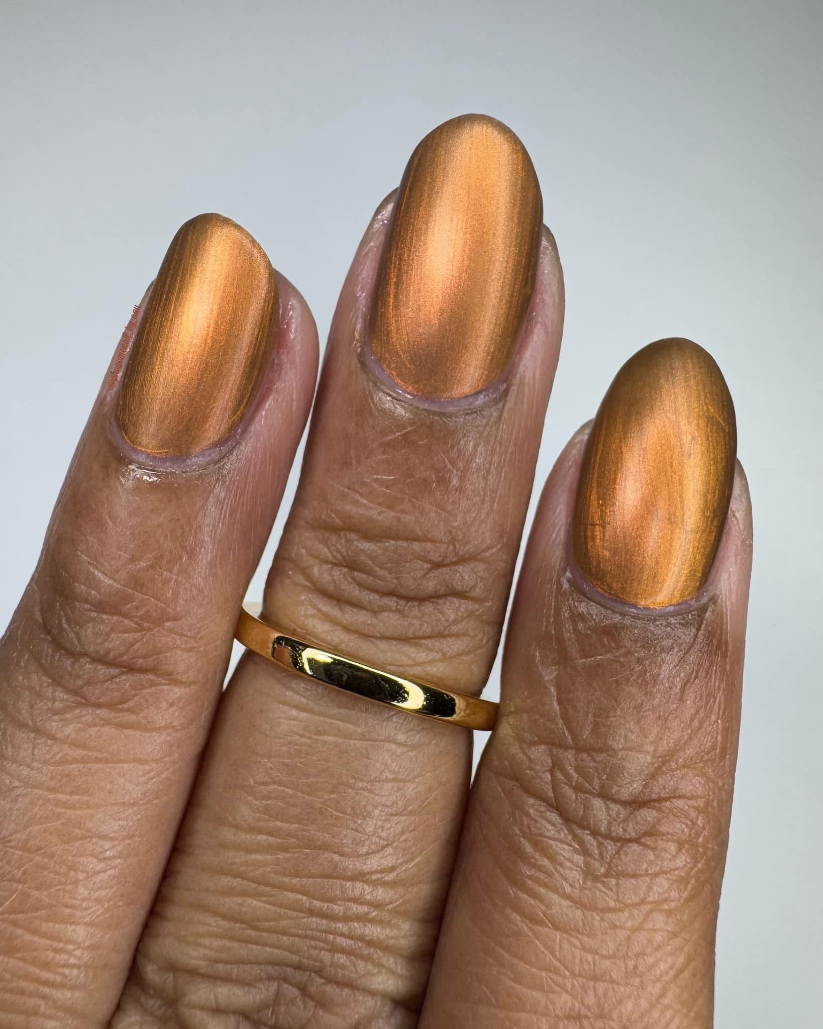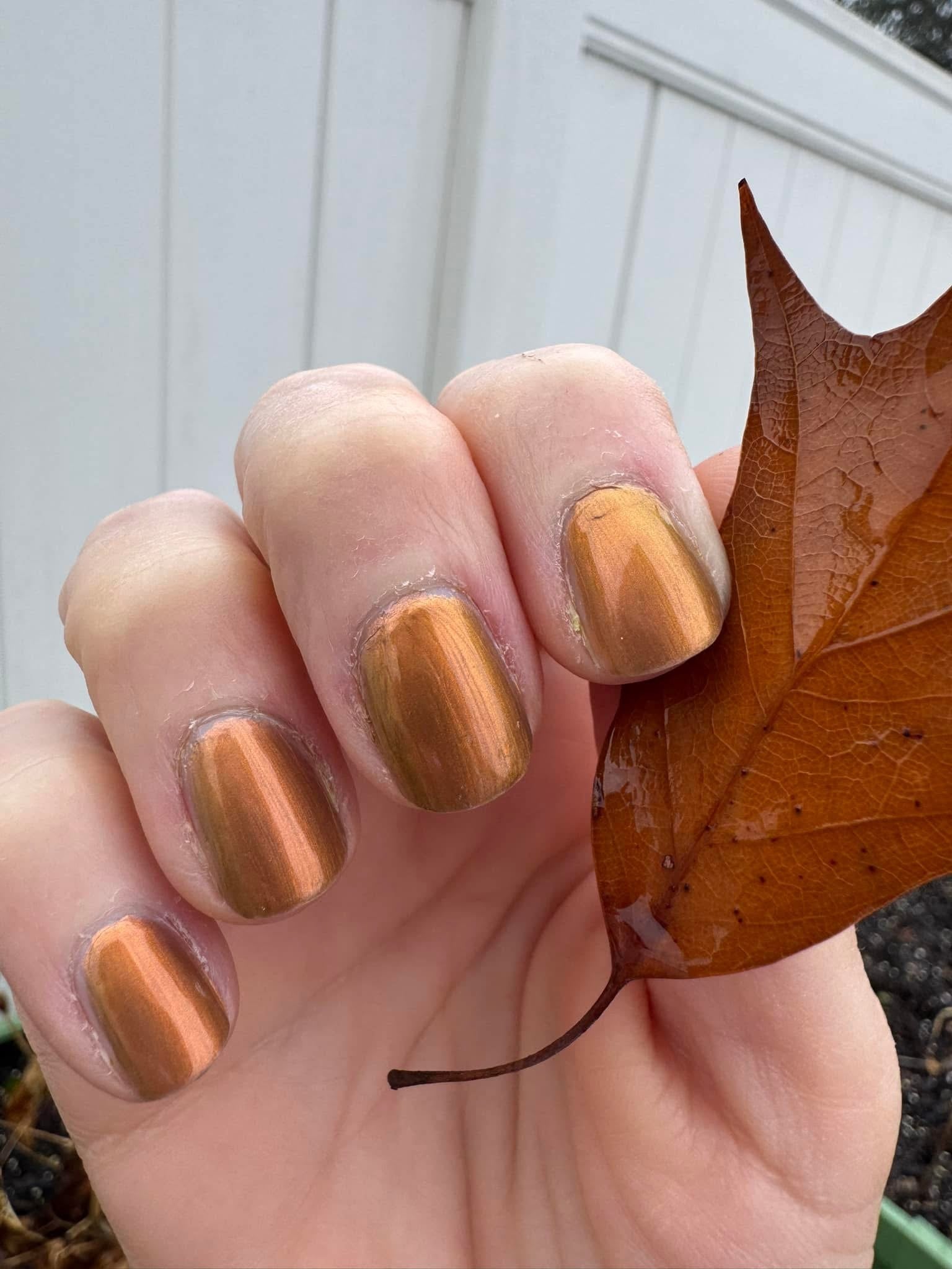 Pere Cheney- copper/brown base with a hint of plum filled with copper to gold shifting shimmer