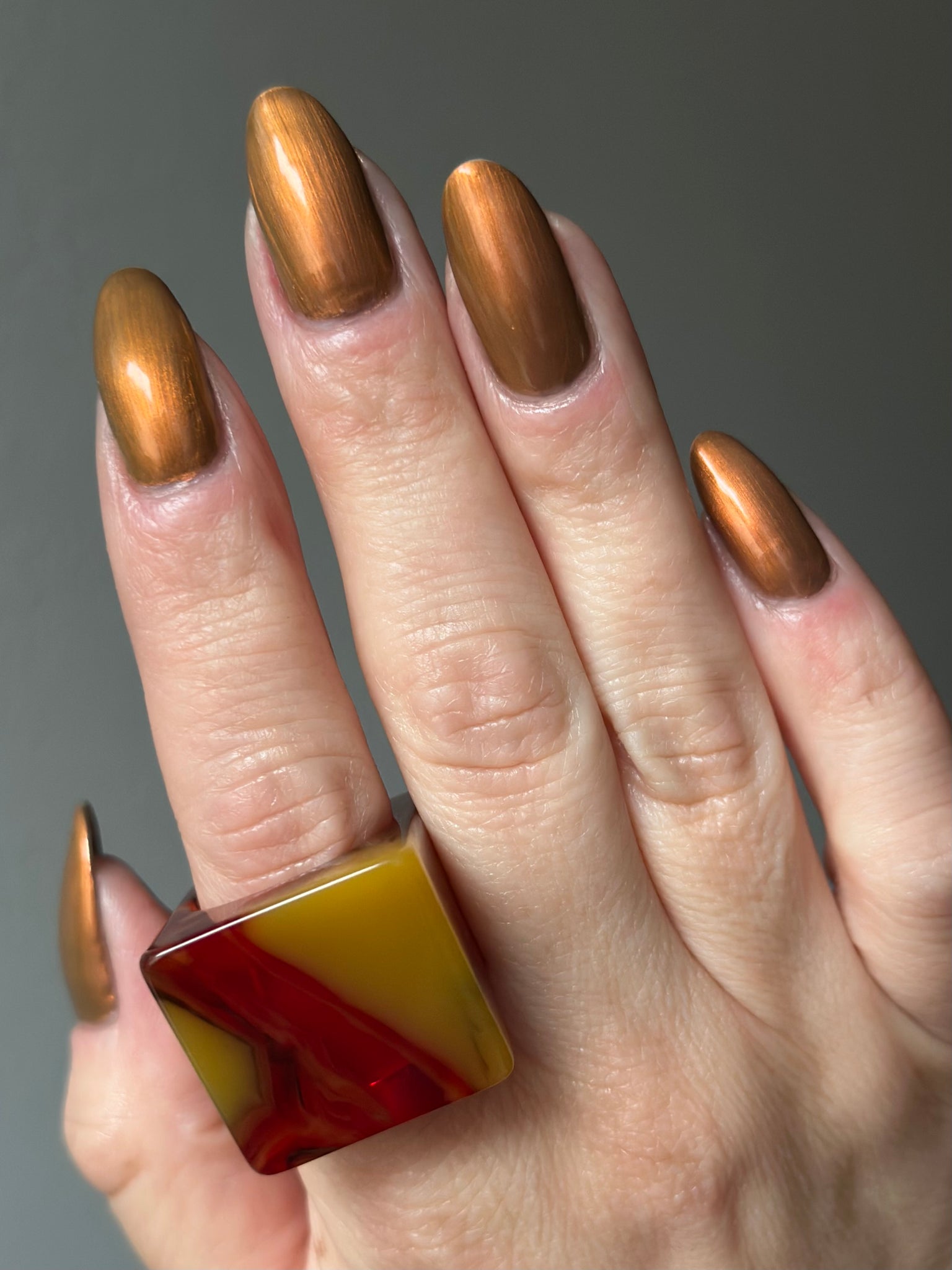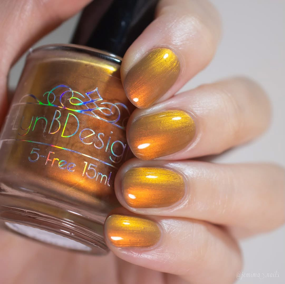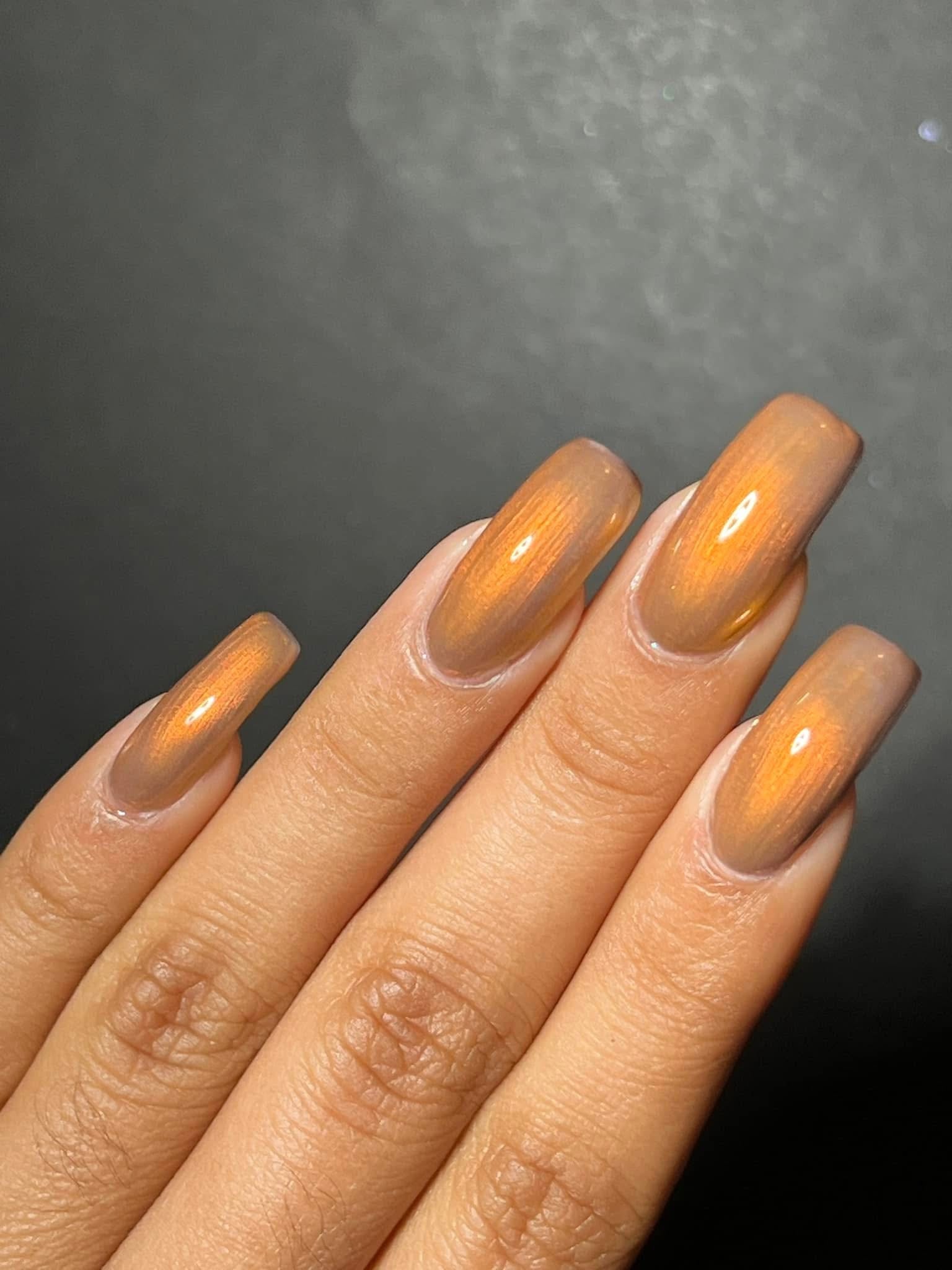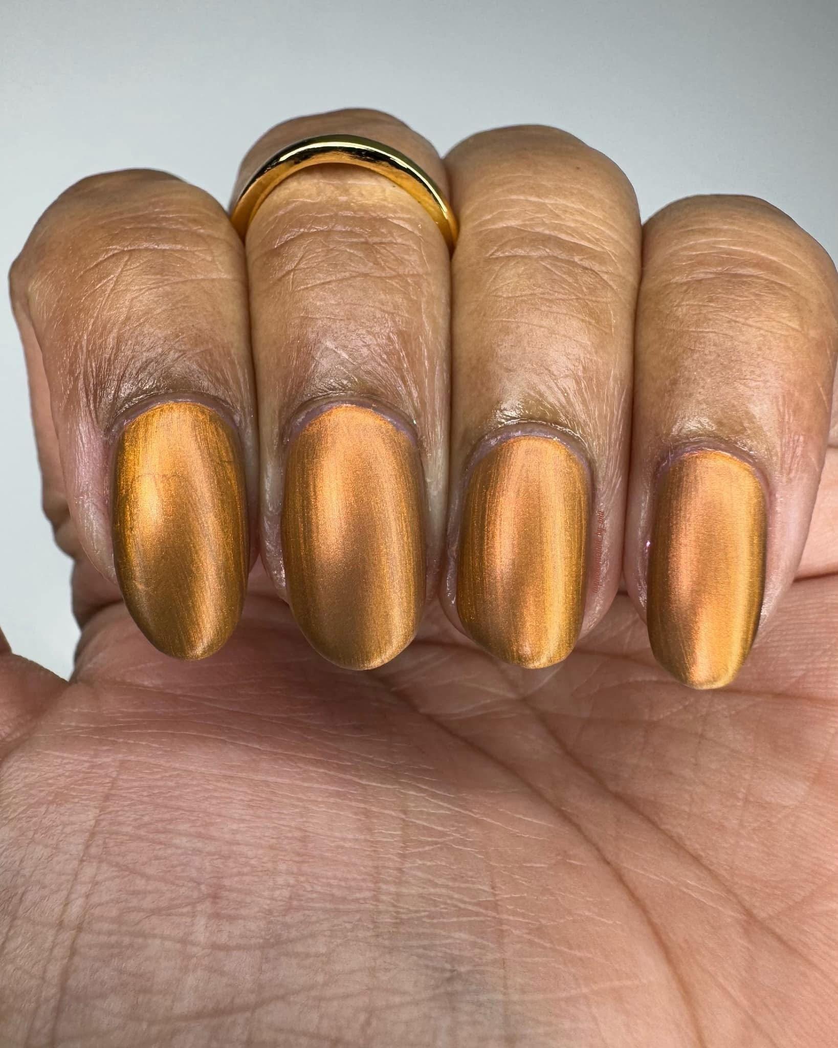 Pere Cheney- copper/brown base with a hint of plum filled with copper to gold shifting shimmer