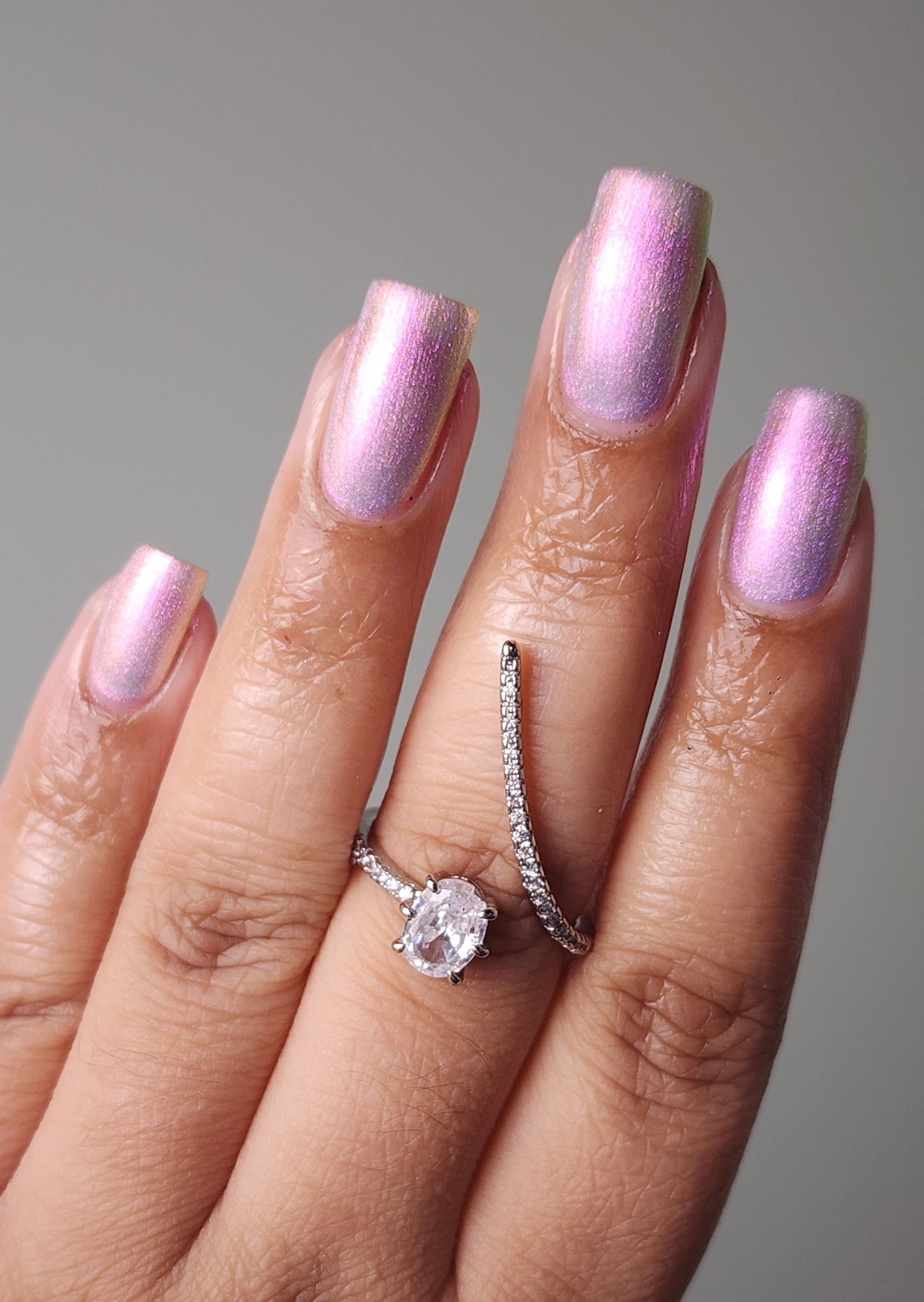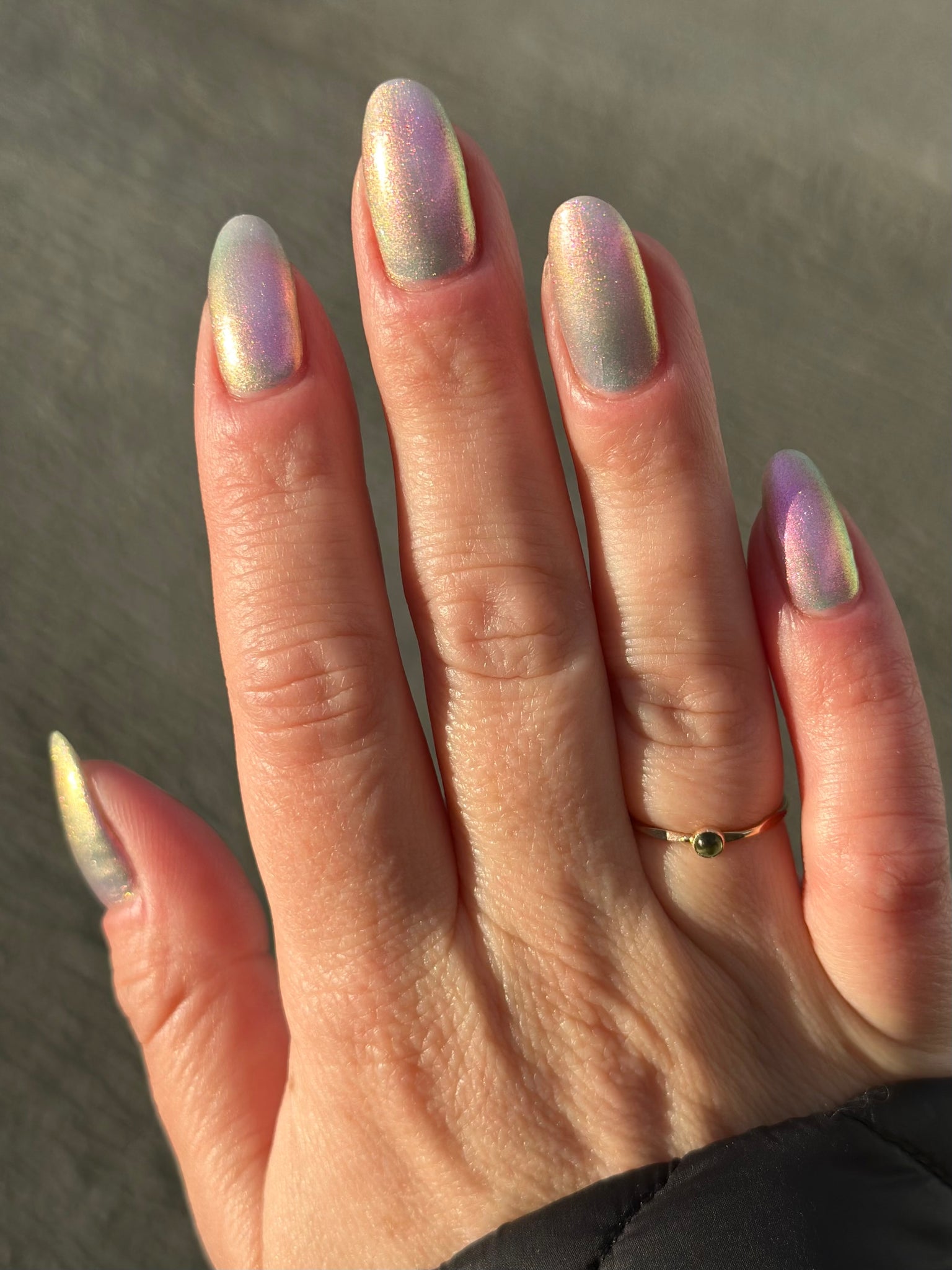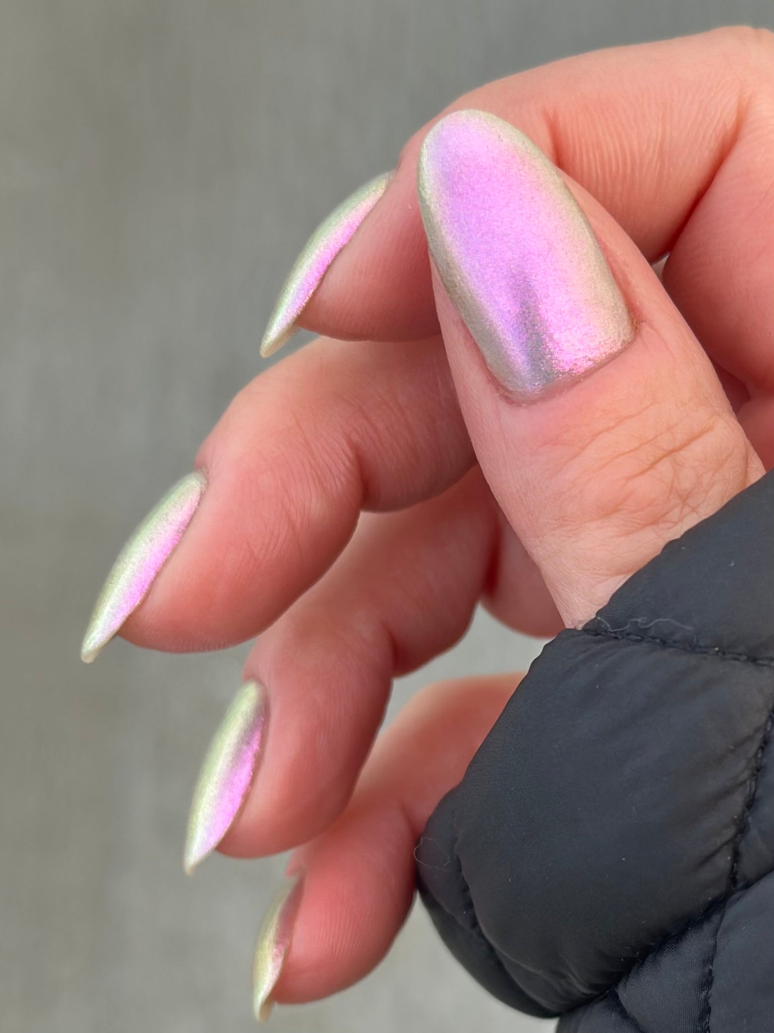 True Love’s Kiss- muted sky blue base with pink to gold to green shifting shimmer