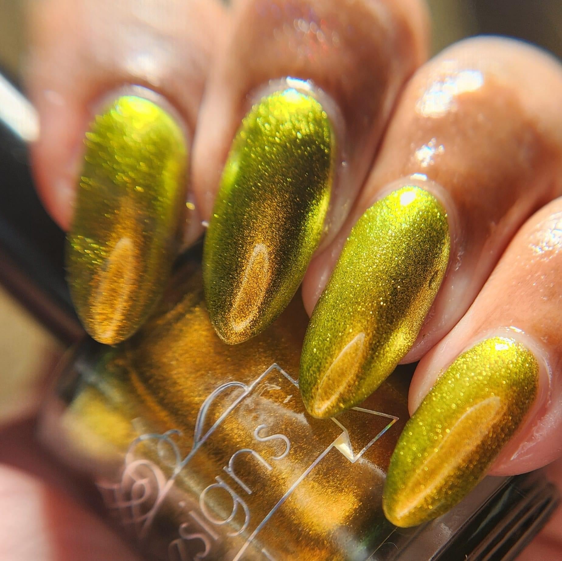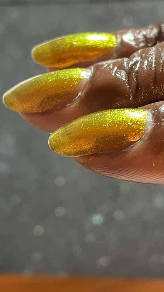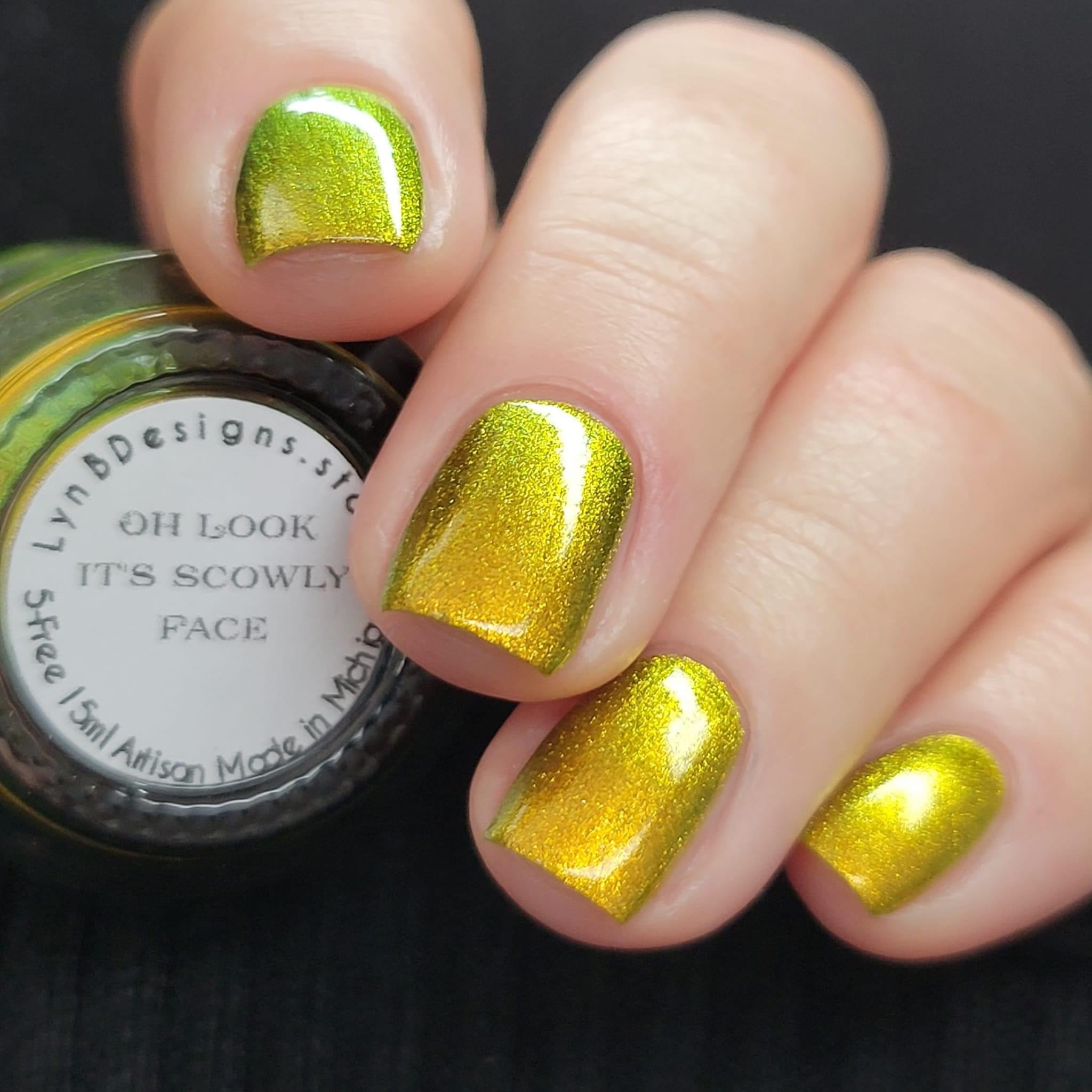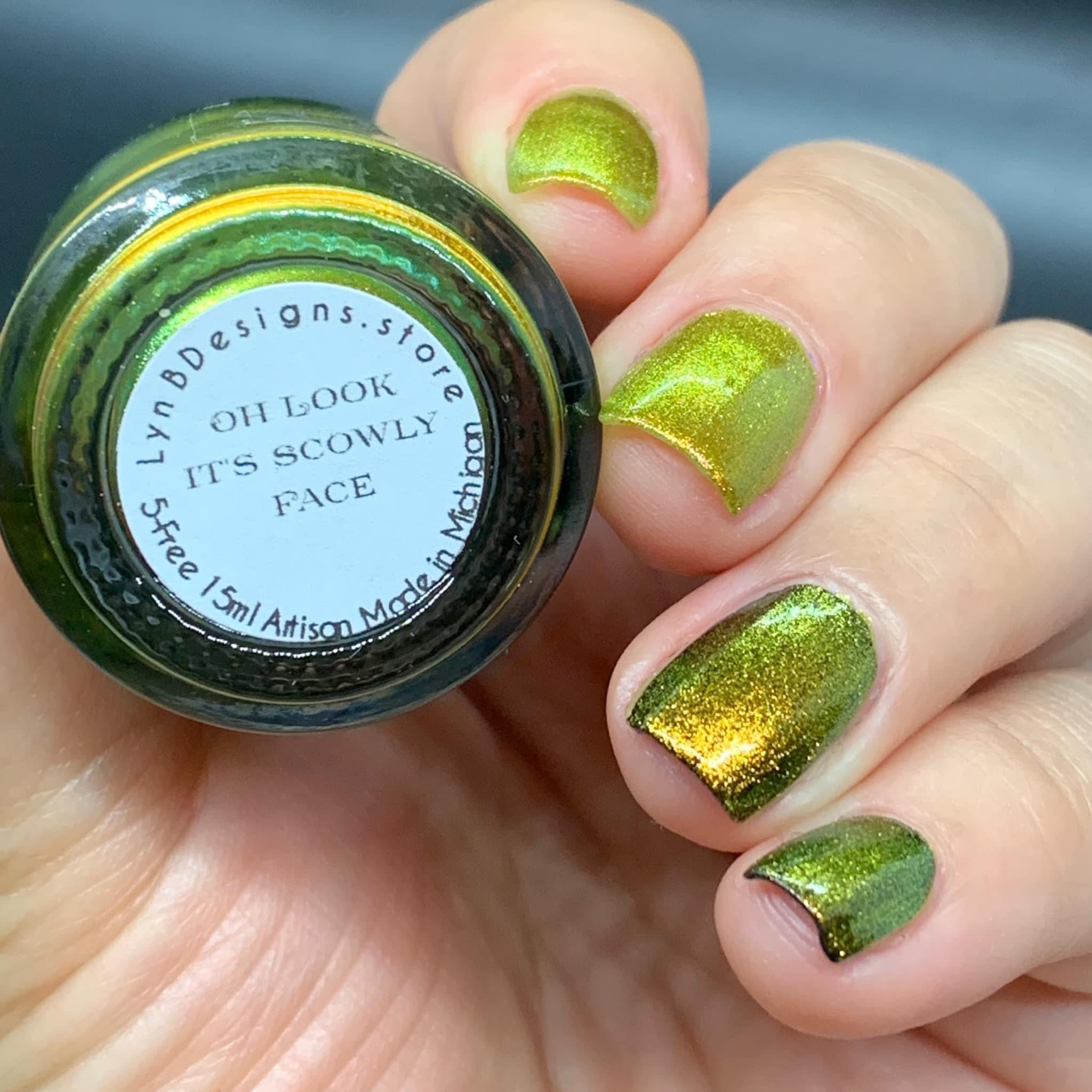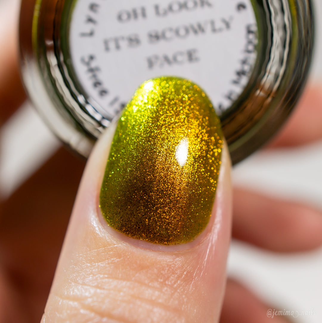 Oh Look It’s Scowly Face- warm yellow base with copper to gold to silver to green shifting multichrome