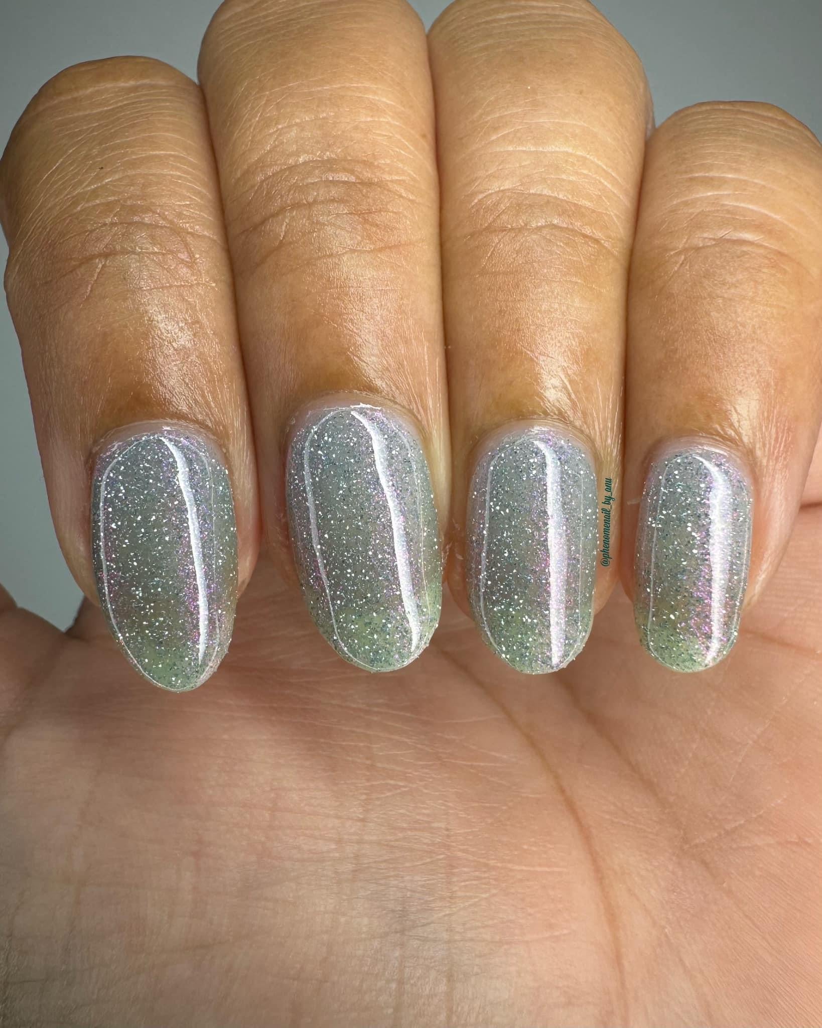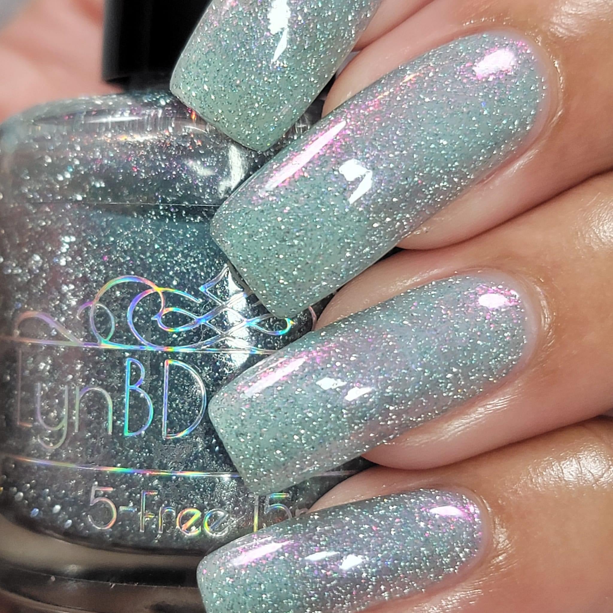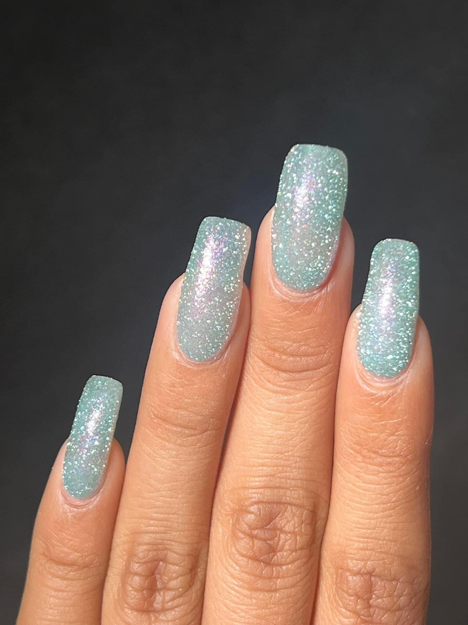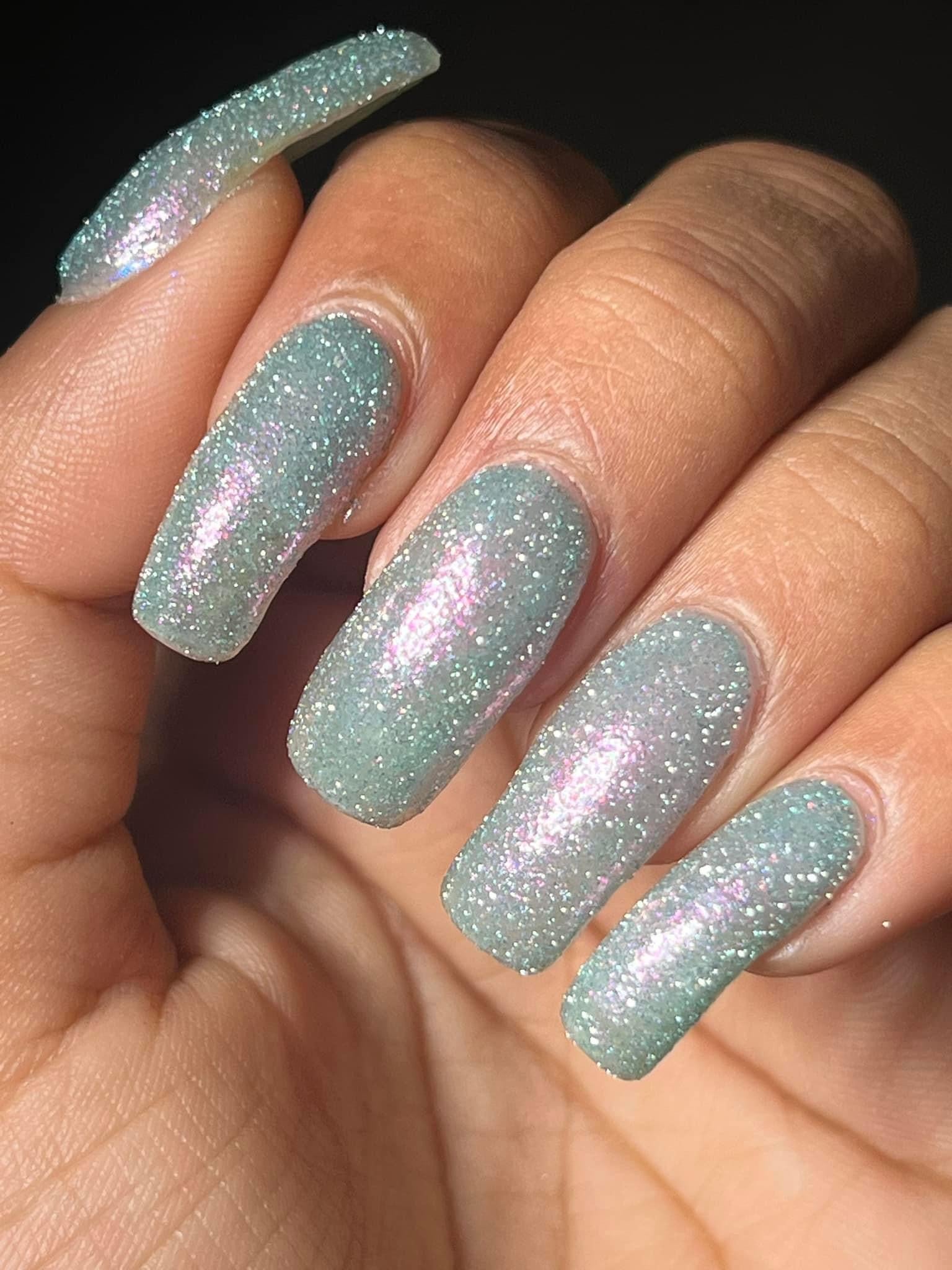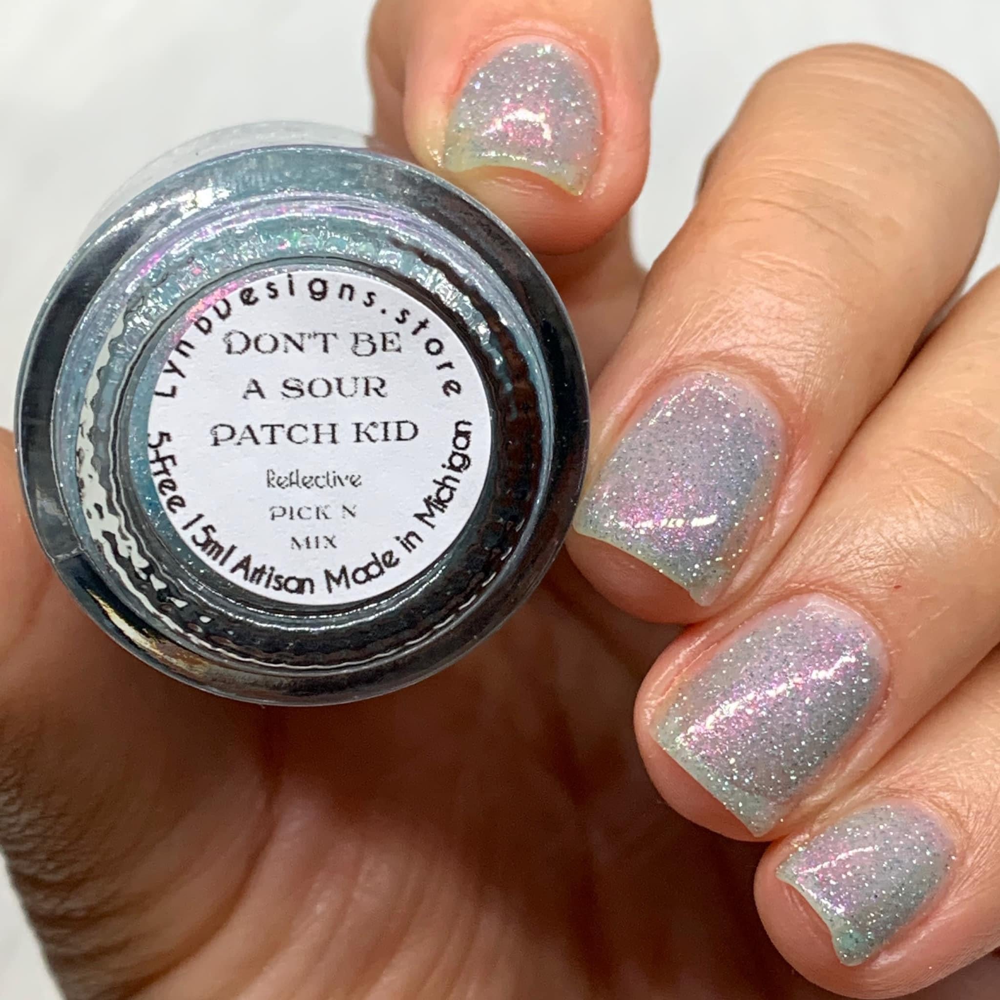 Don’t Be a Sour Patch Kid- light blue tinted base with pink to red shifting shimmer and silver light reflective glitter- may stain