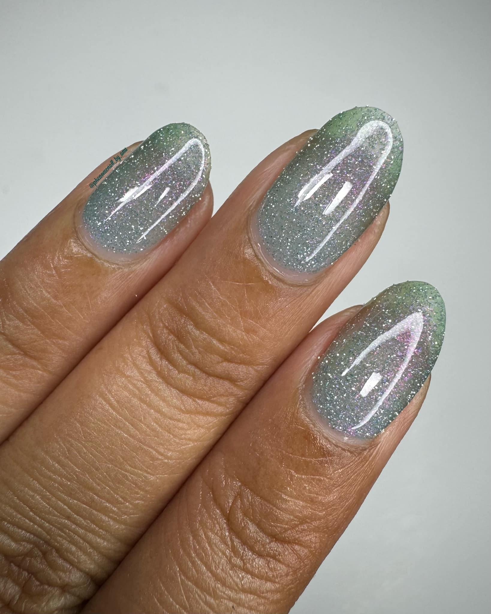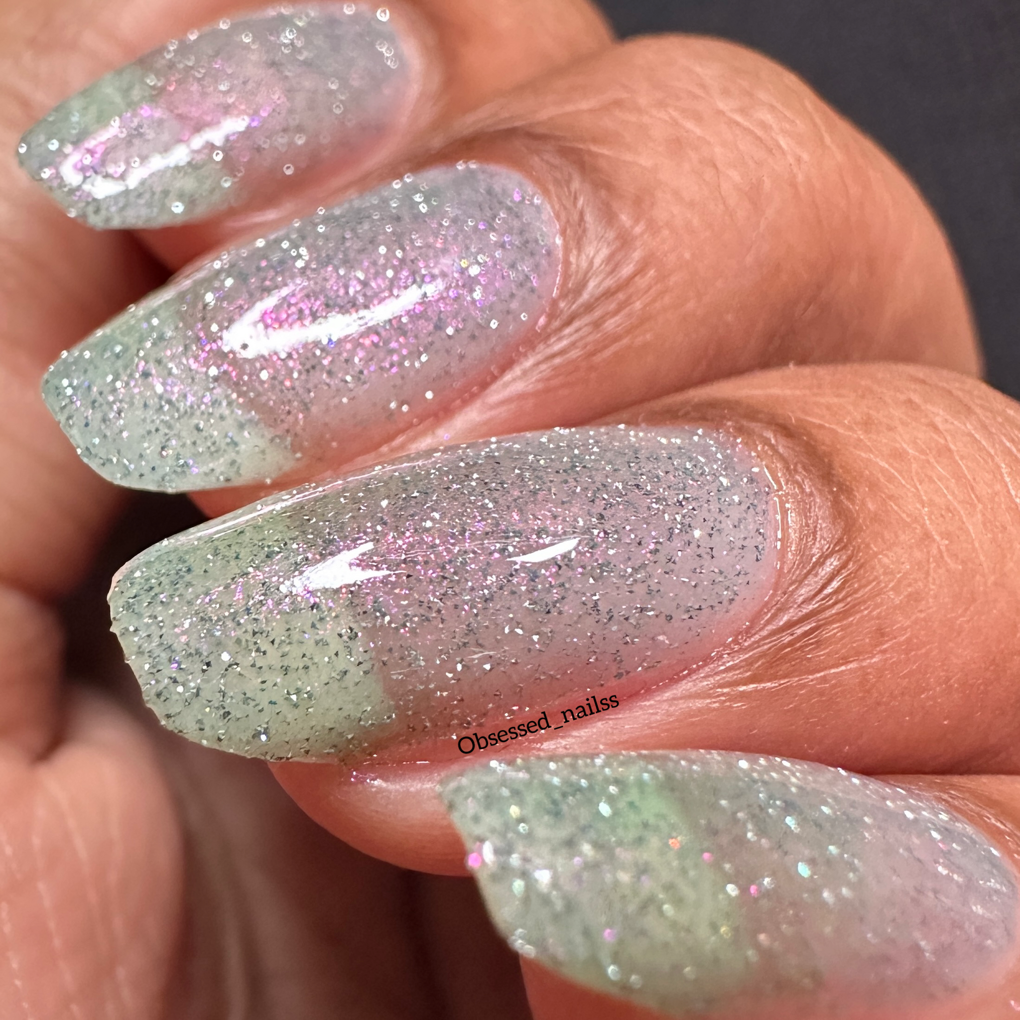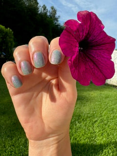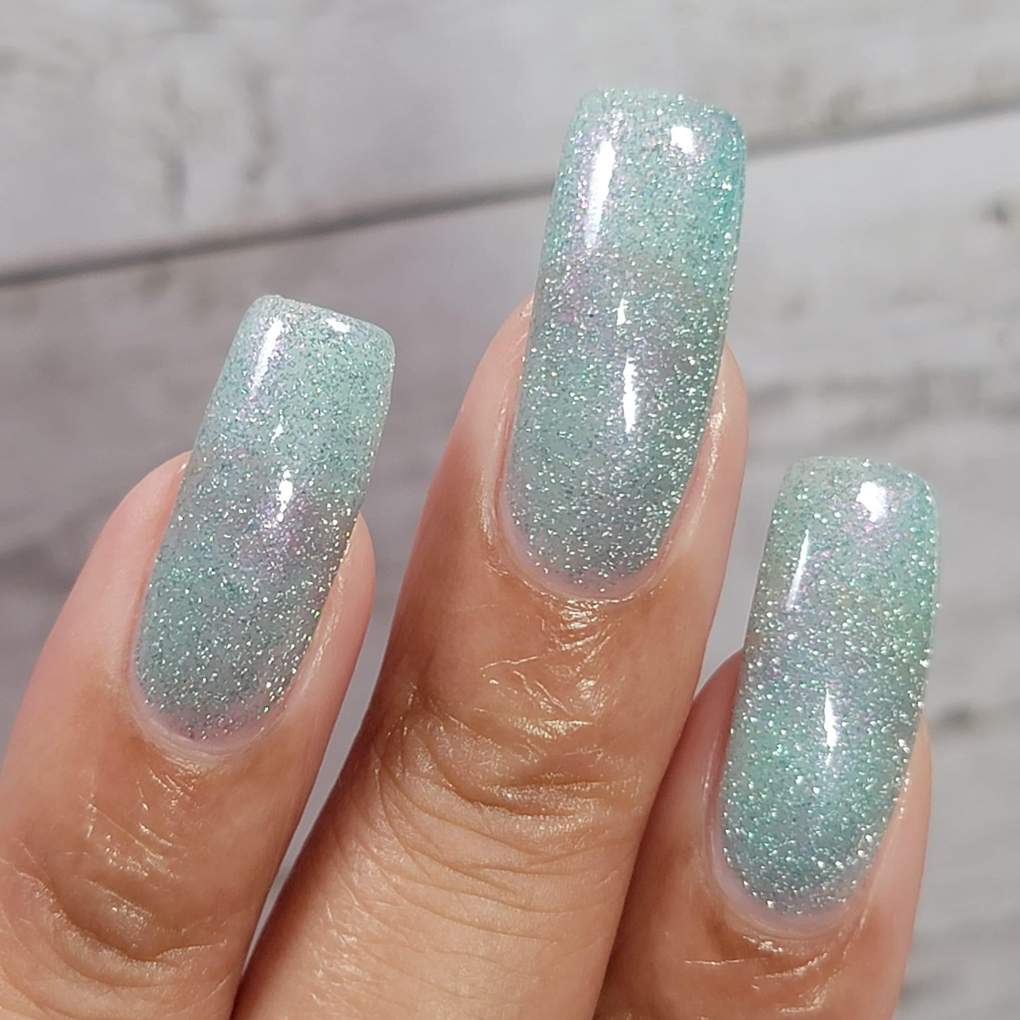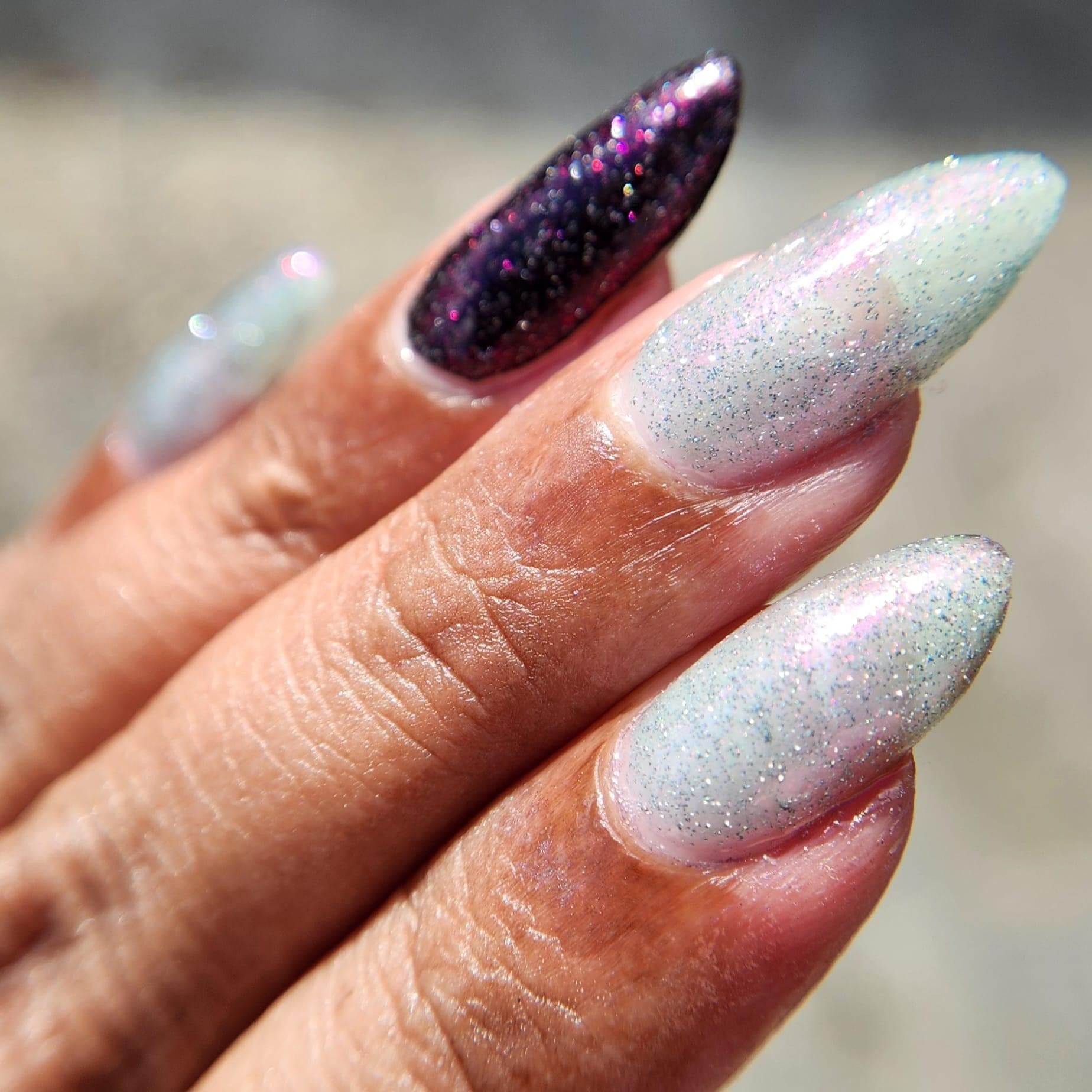 Don’t Be a Sour Patch Kid- light blue tinted base with pink to red shifting shimmer and silver light reflective glitter- may stain