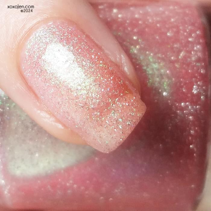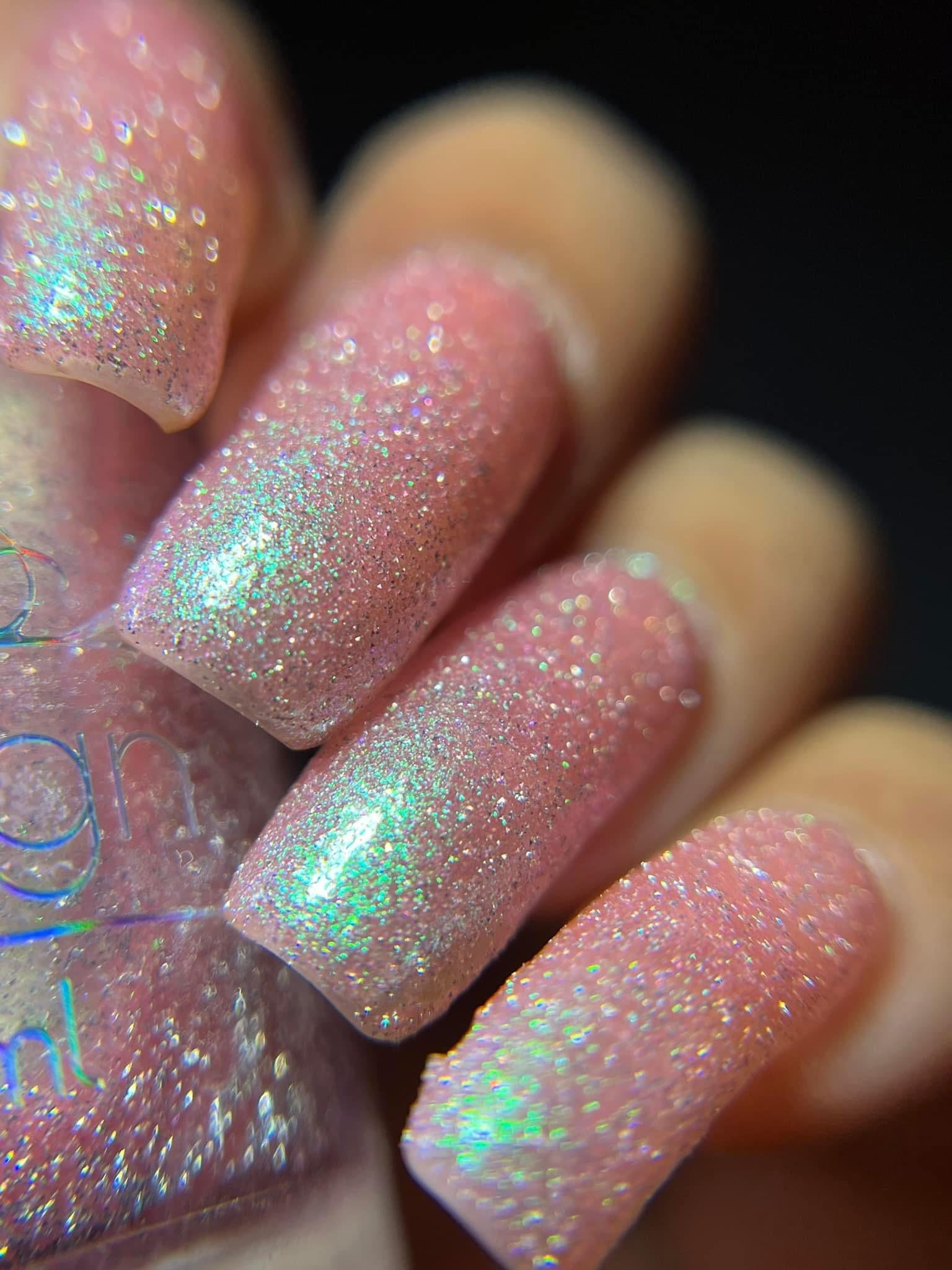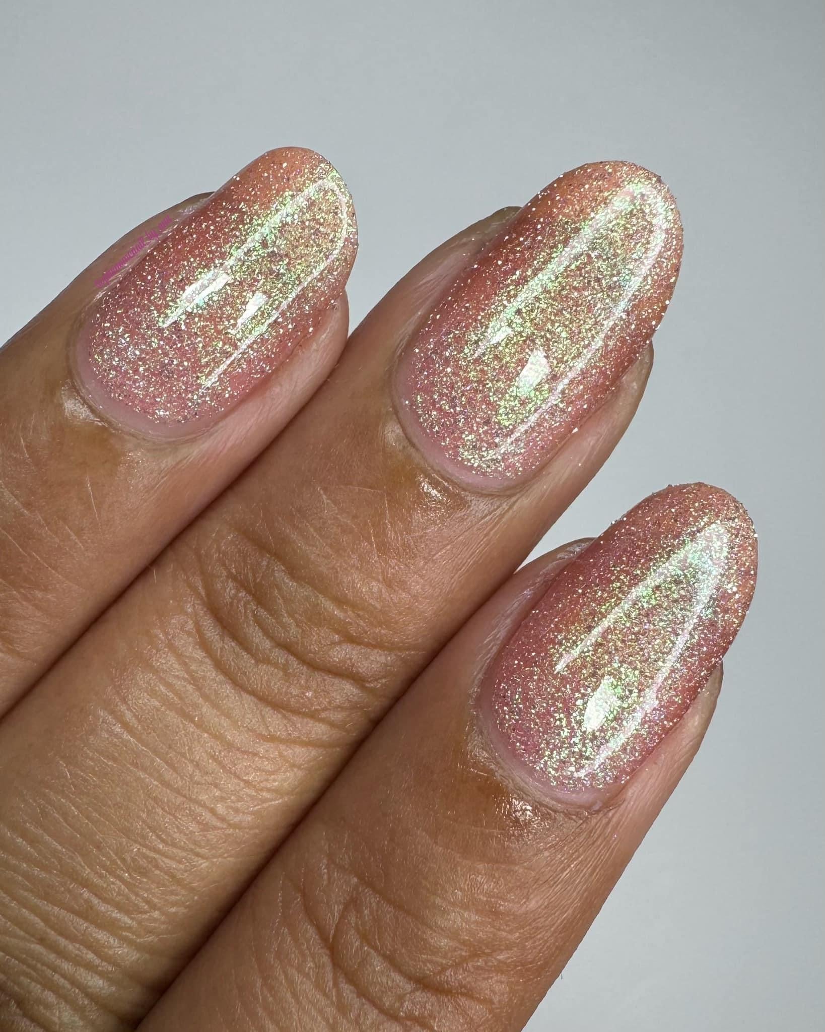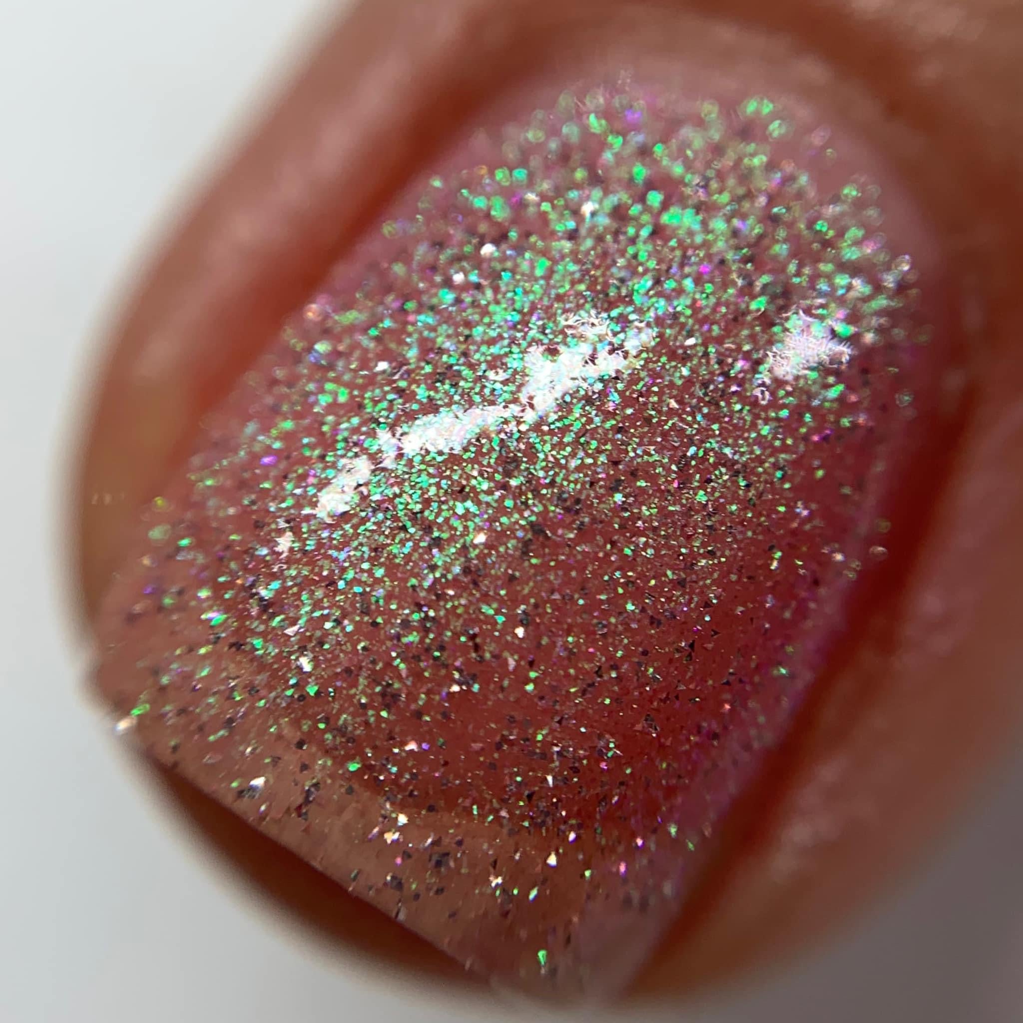 Sweet As Candy- peachy pink tinted base with green to purple shifting shimmer and silver light reflective glitter