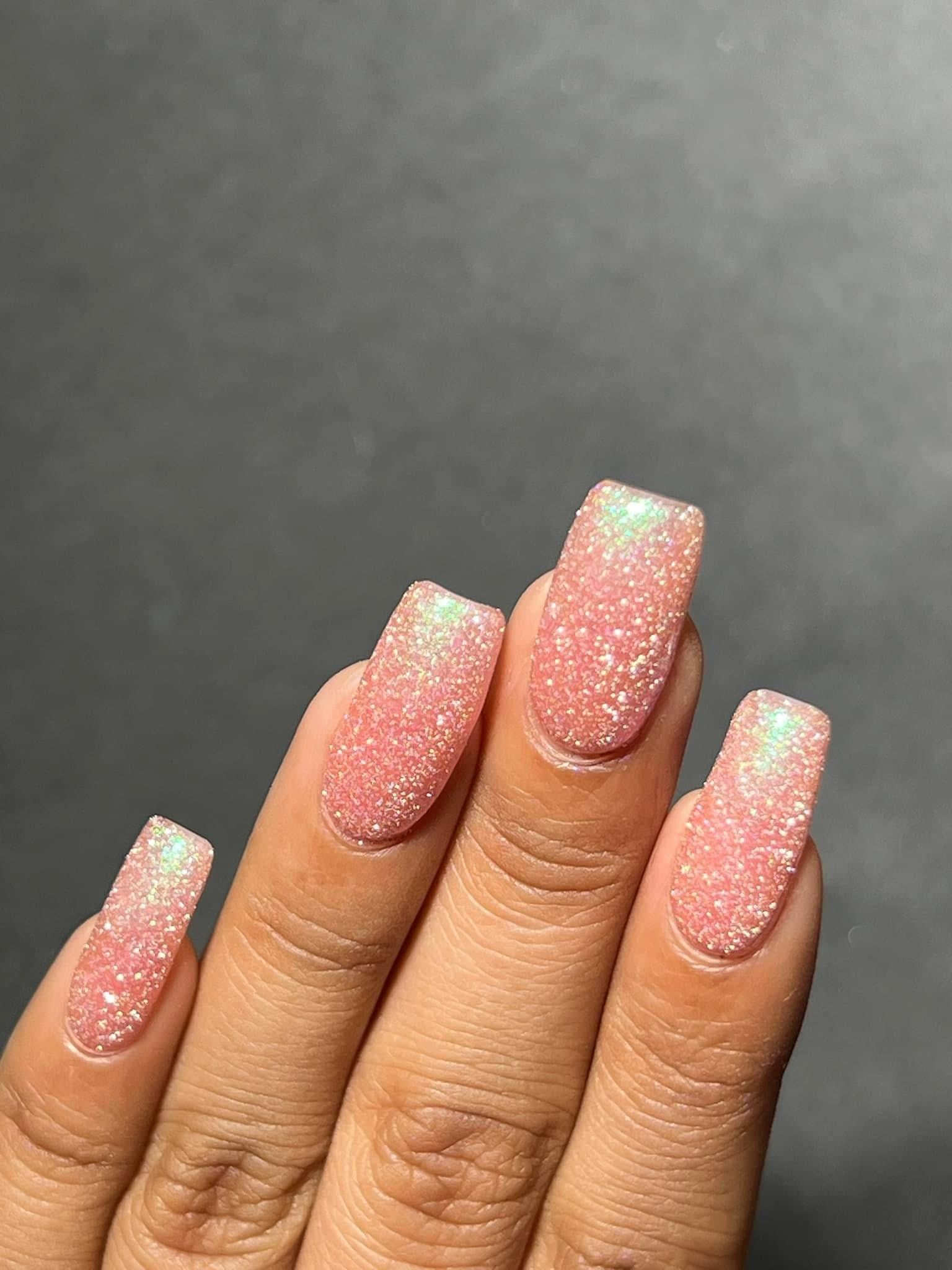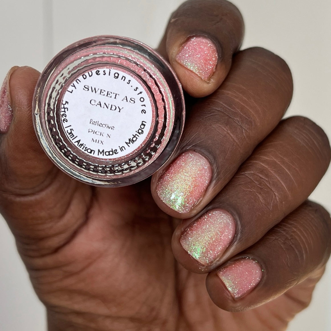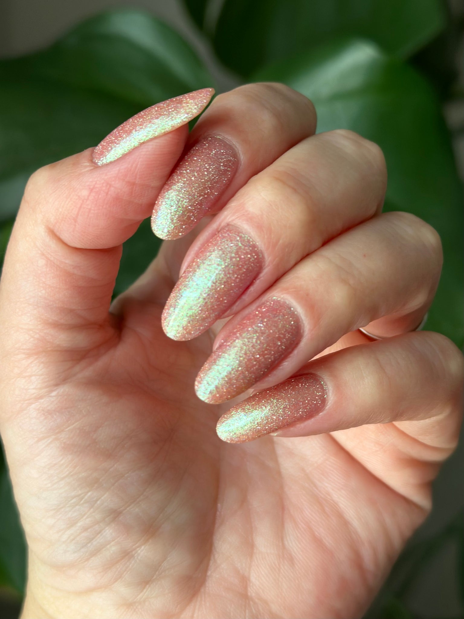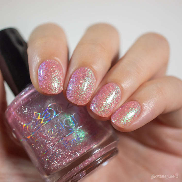 Sweet As Candy- peachy pink tinted base with green to purple shifting shimmer and silver light reflective glitter