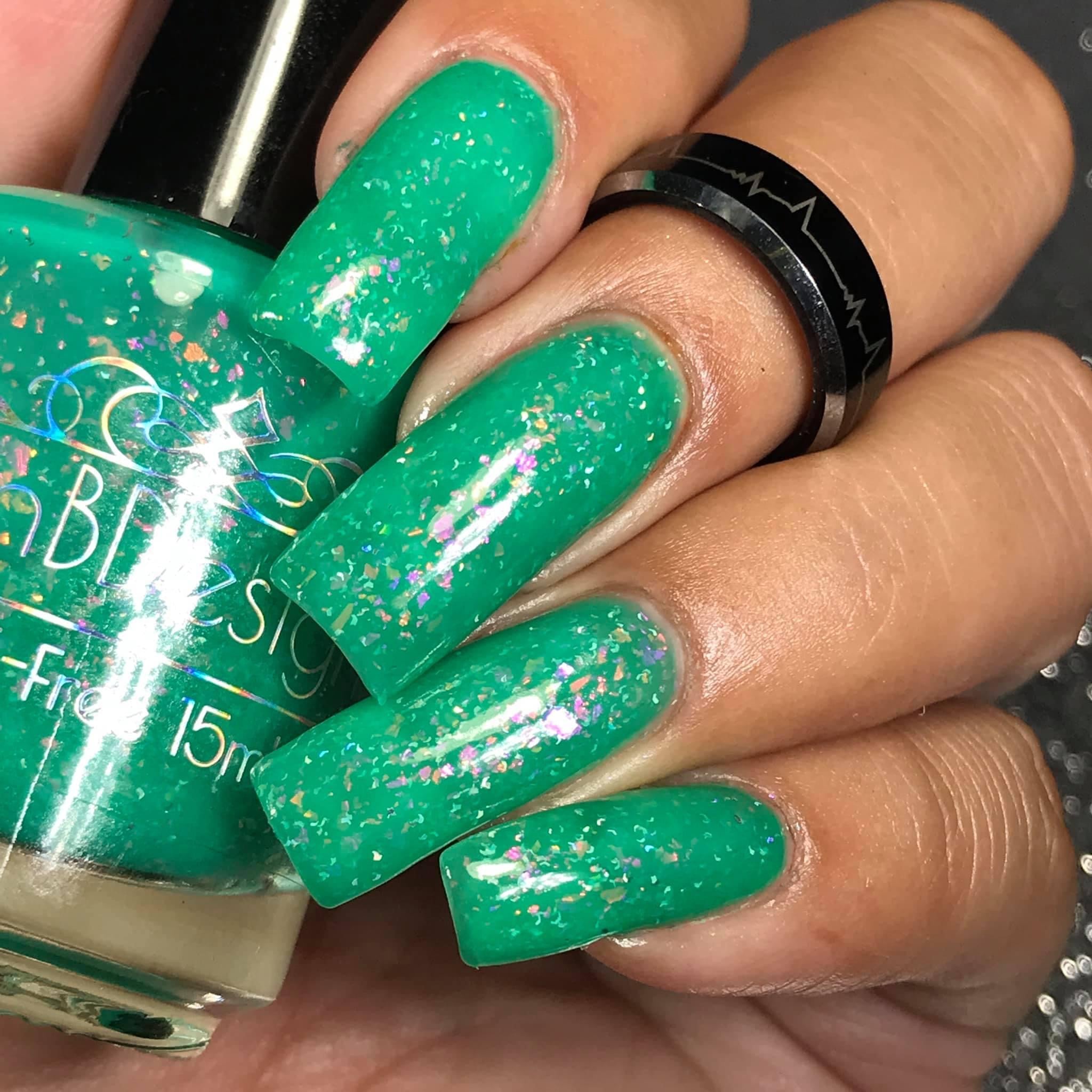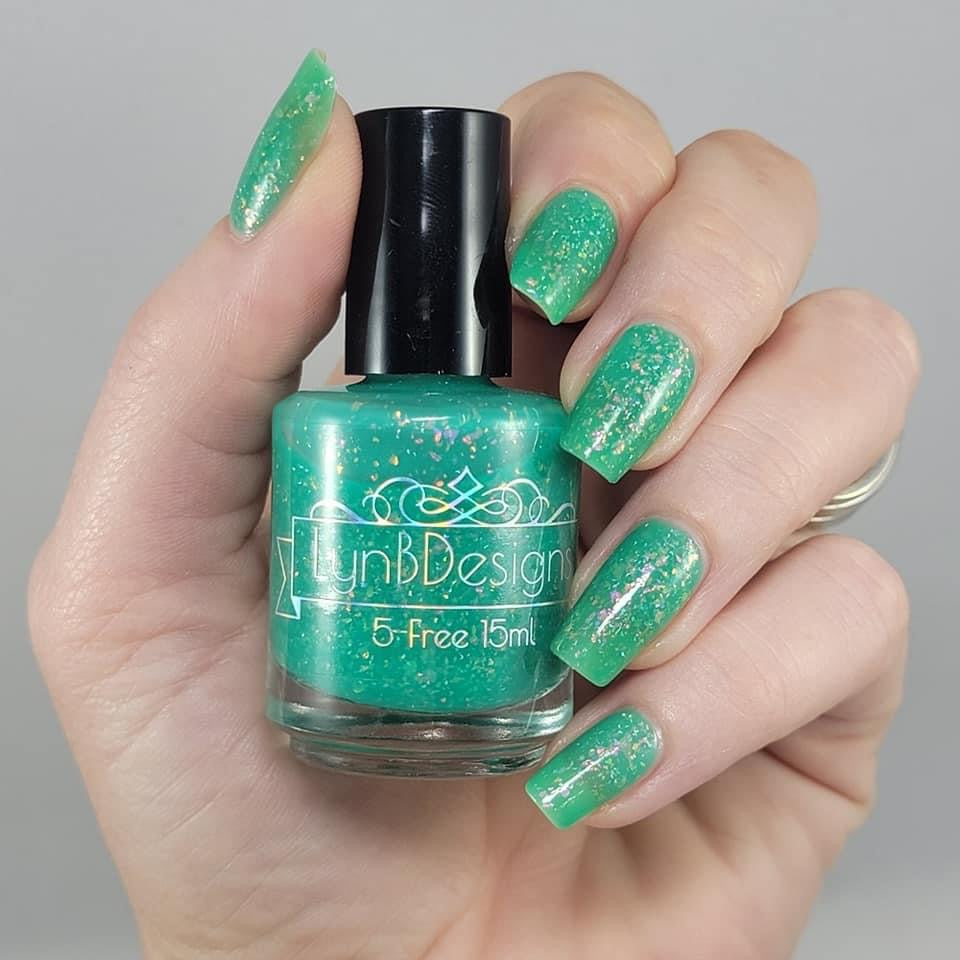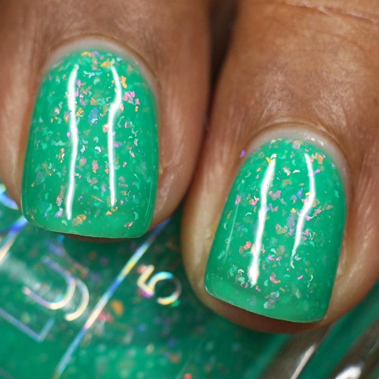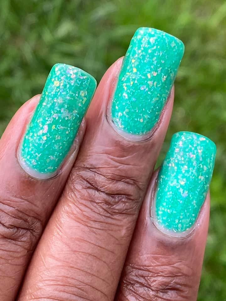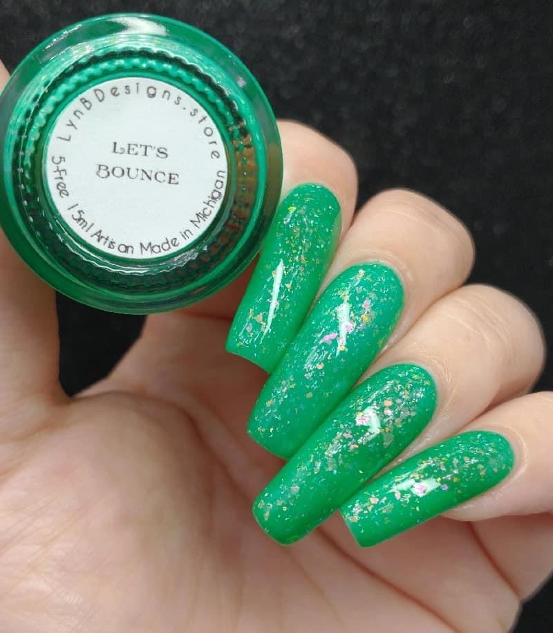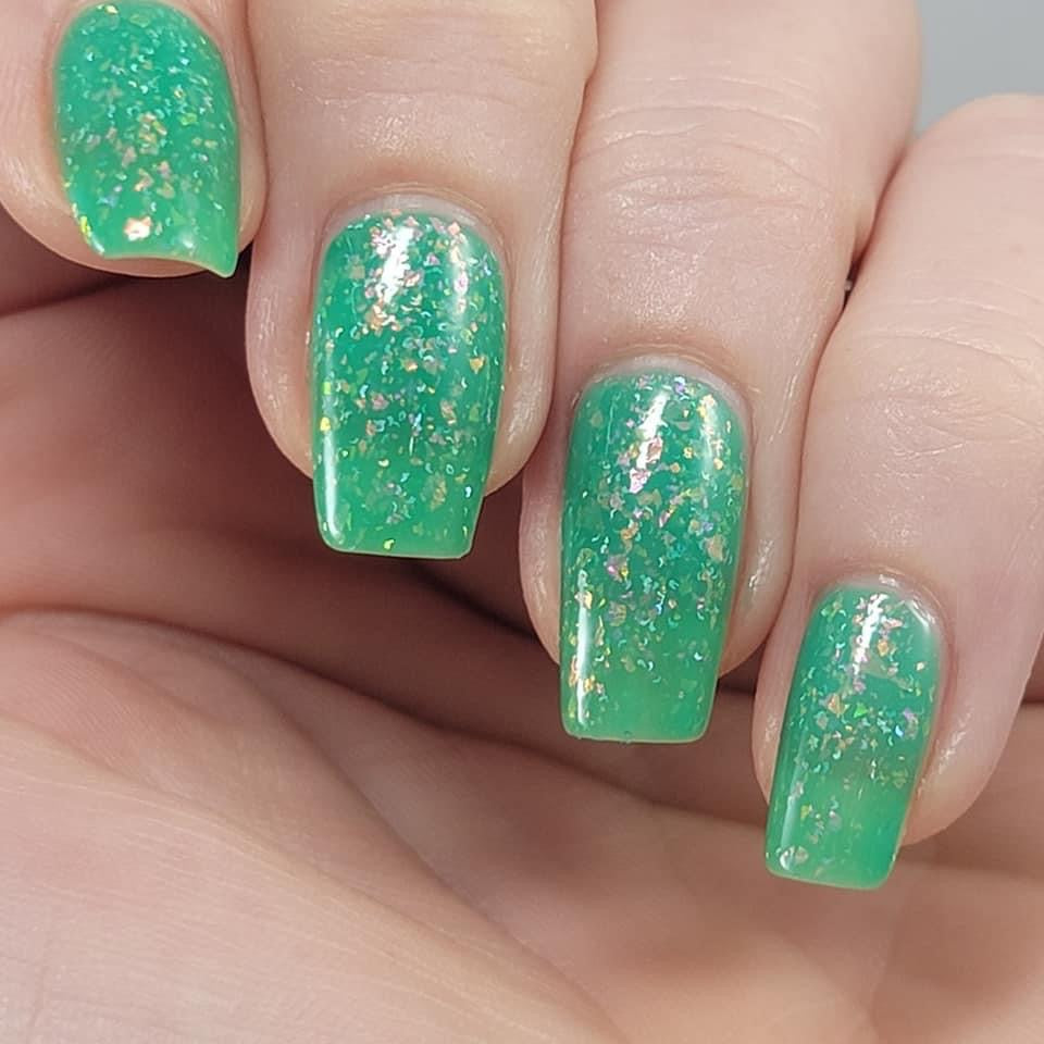 Let’s Bounce- teal neon jelly filled with red to orange for to yellow shifting flakies and a touch of holo sparkle