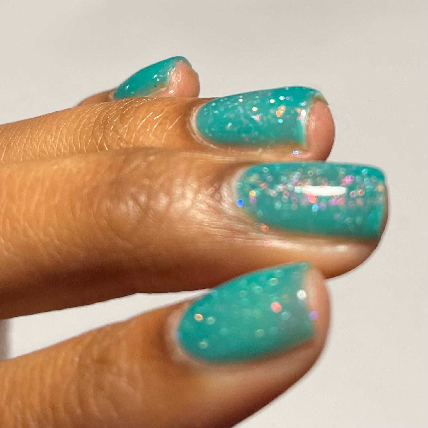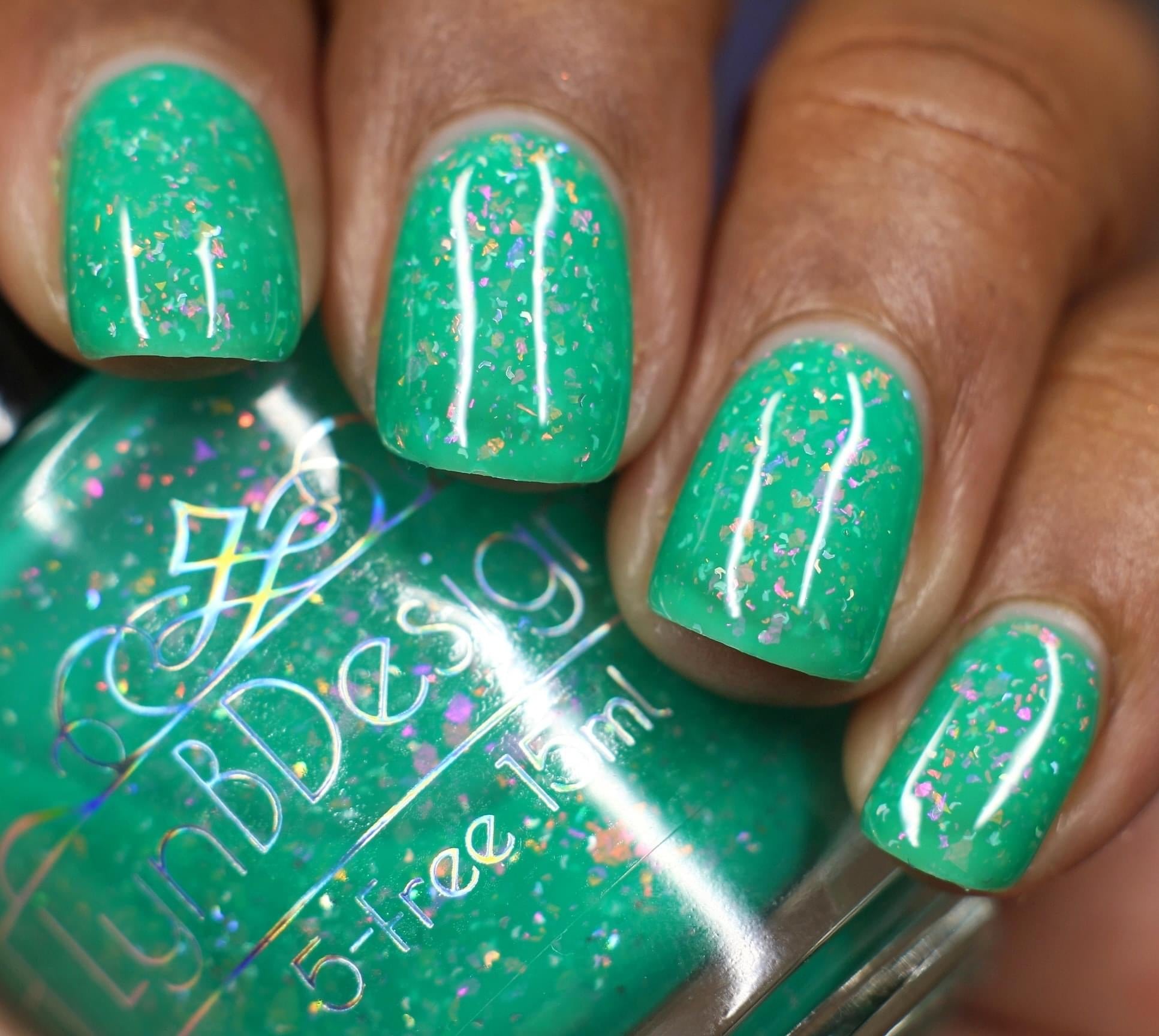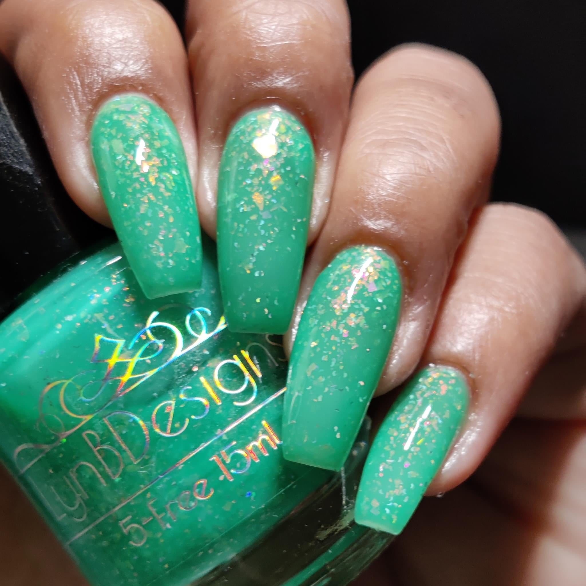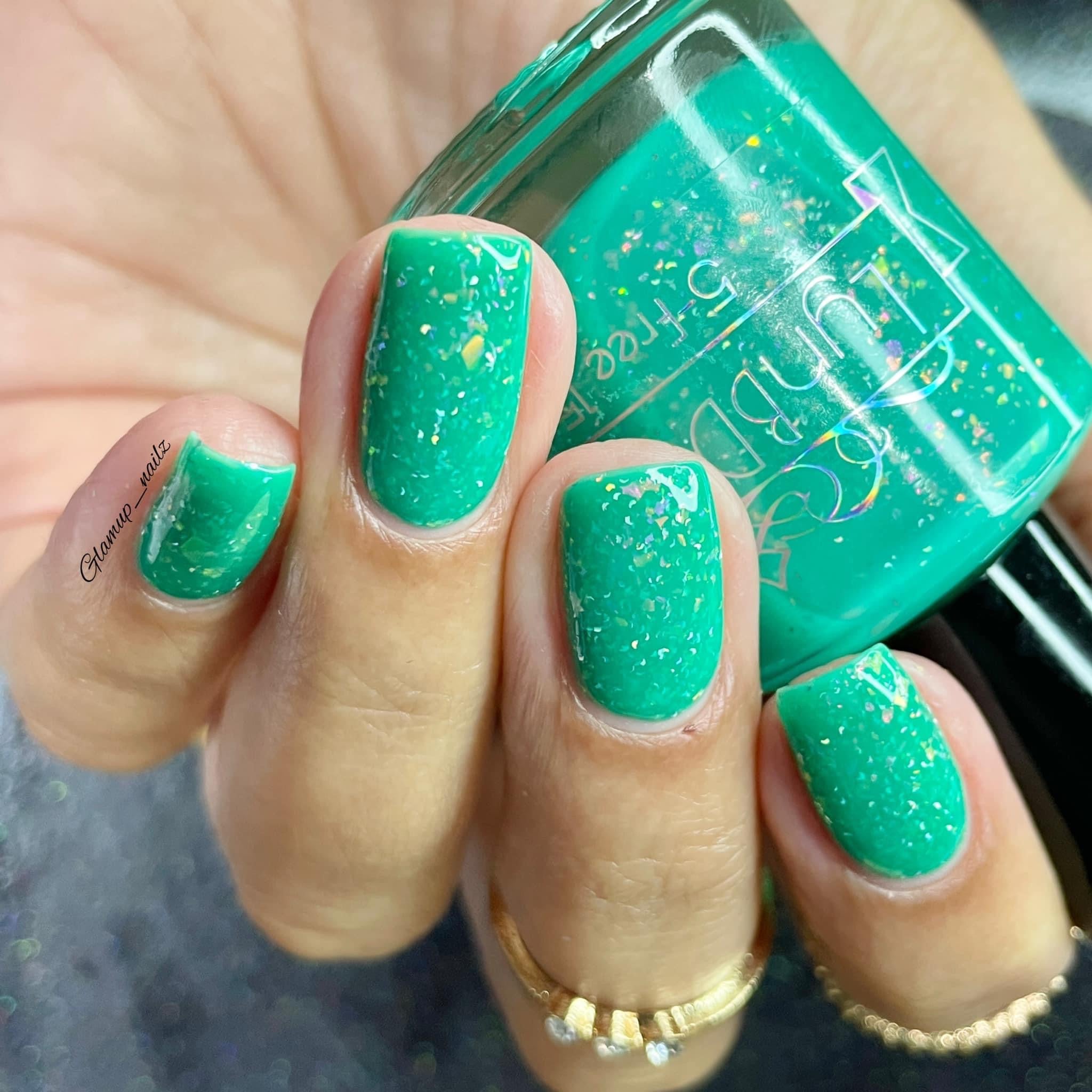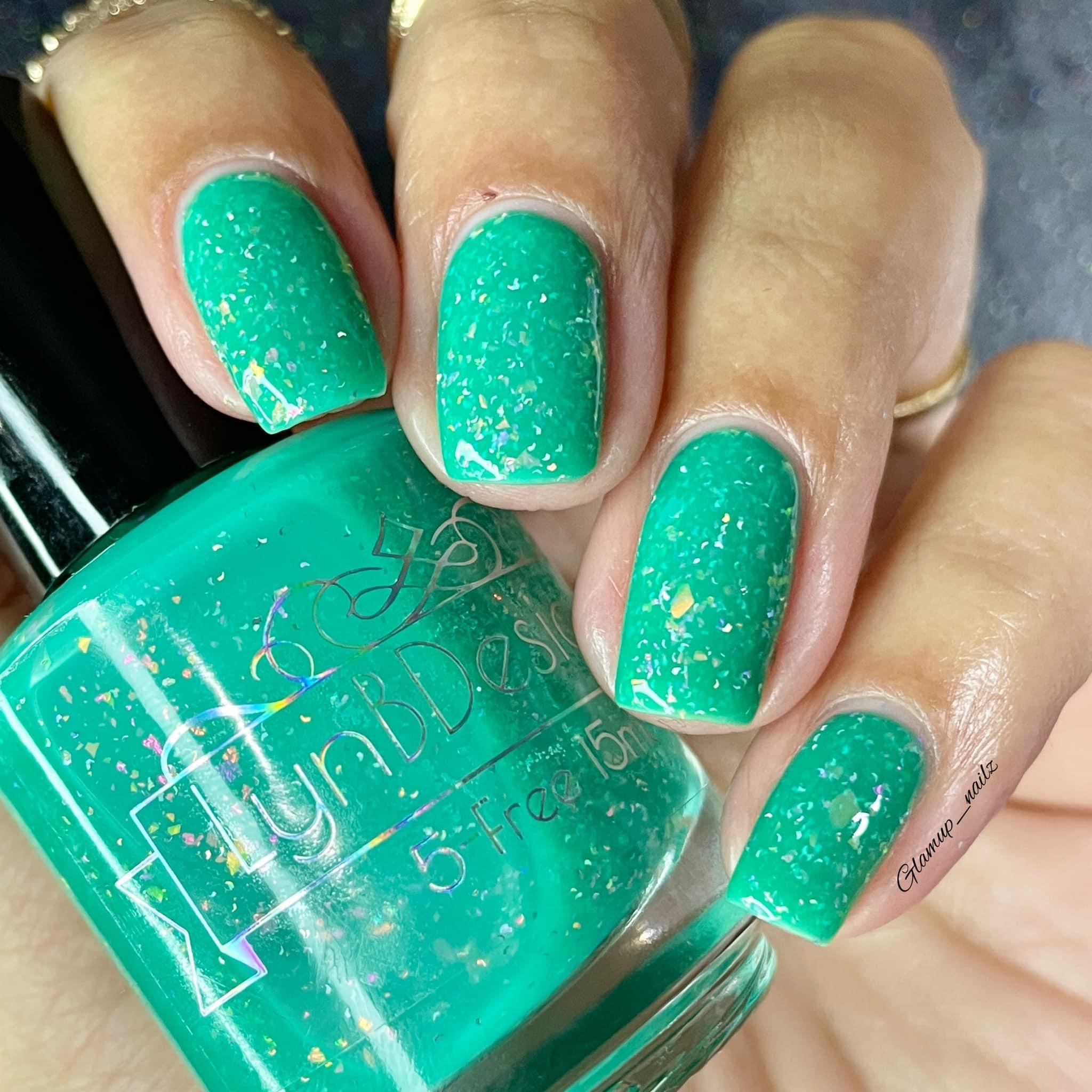 Let’s Bounce- teal neon jelly filled with red to orange for to yellow shifting flakies and a touch of holo sparkle