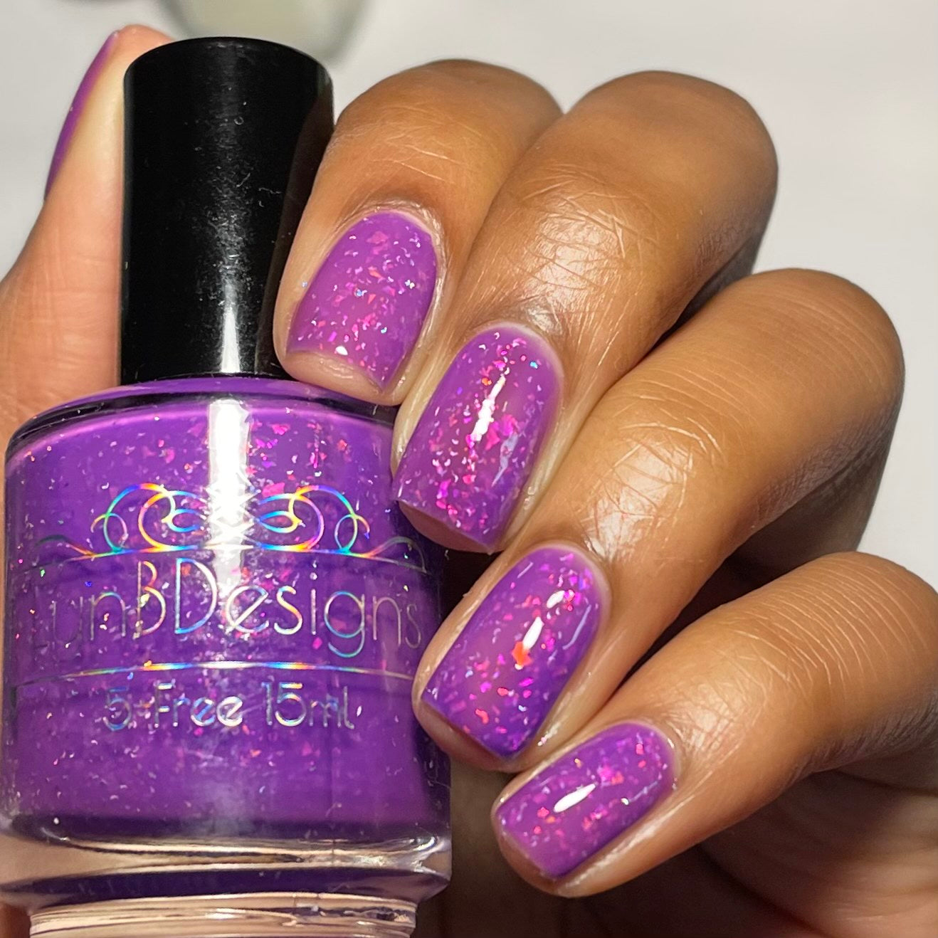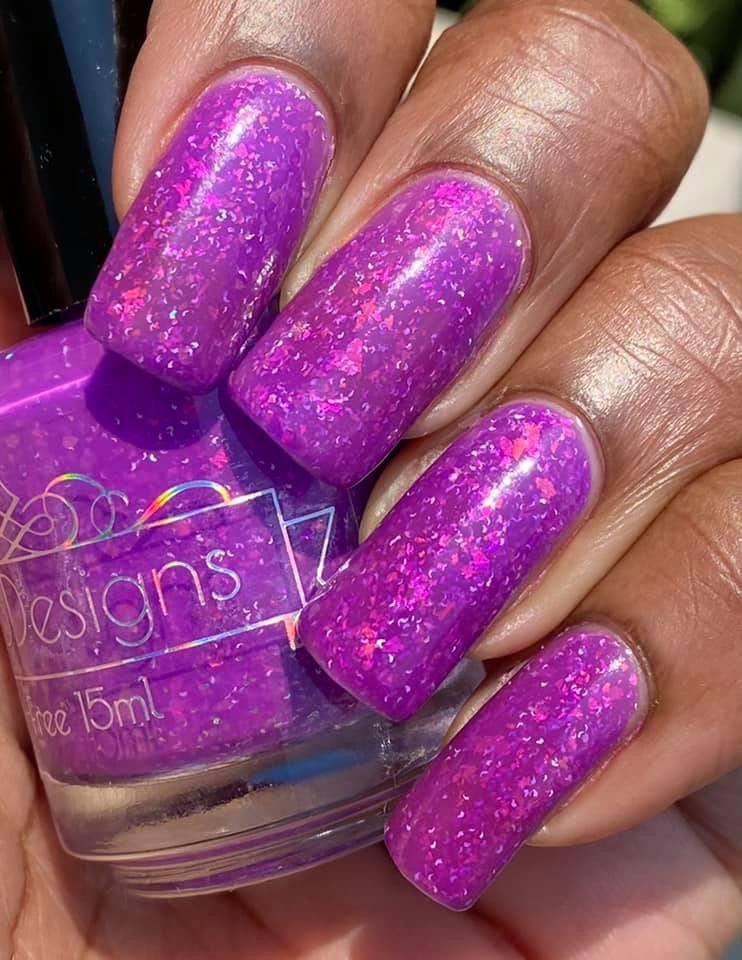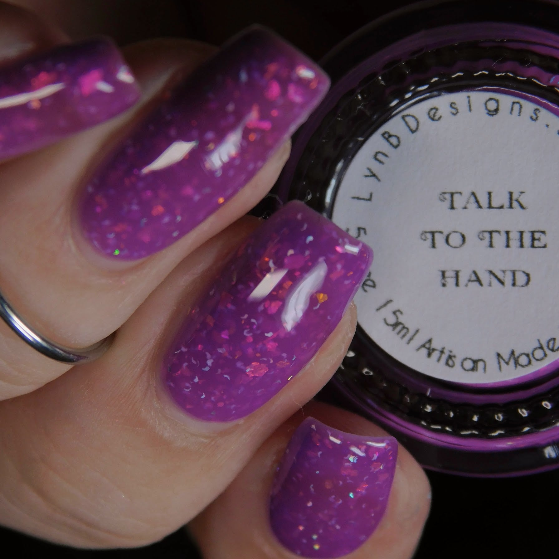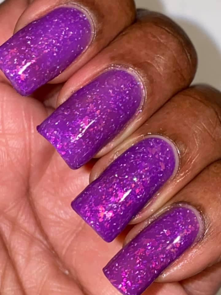 Talk to the Hand- purple jelly base filled with red to orange to yellow shifting flakies and a touch of holo sparkle