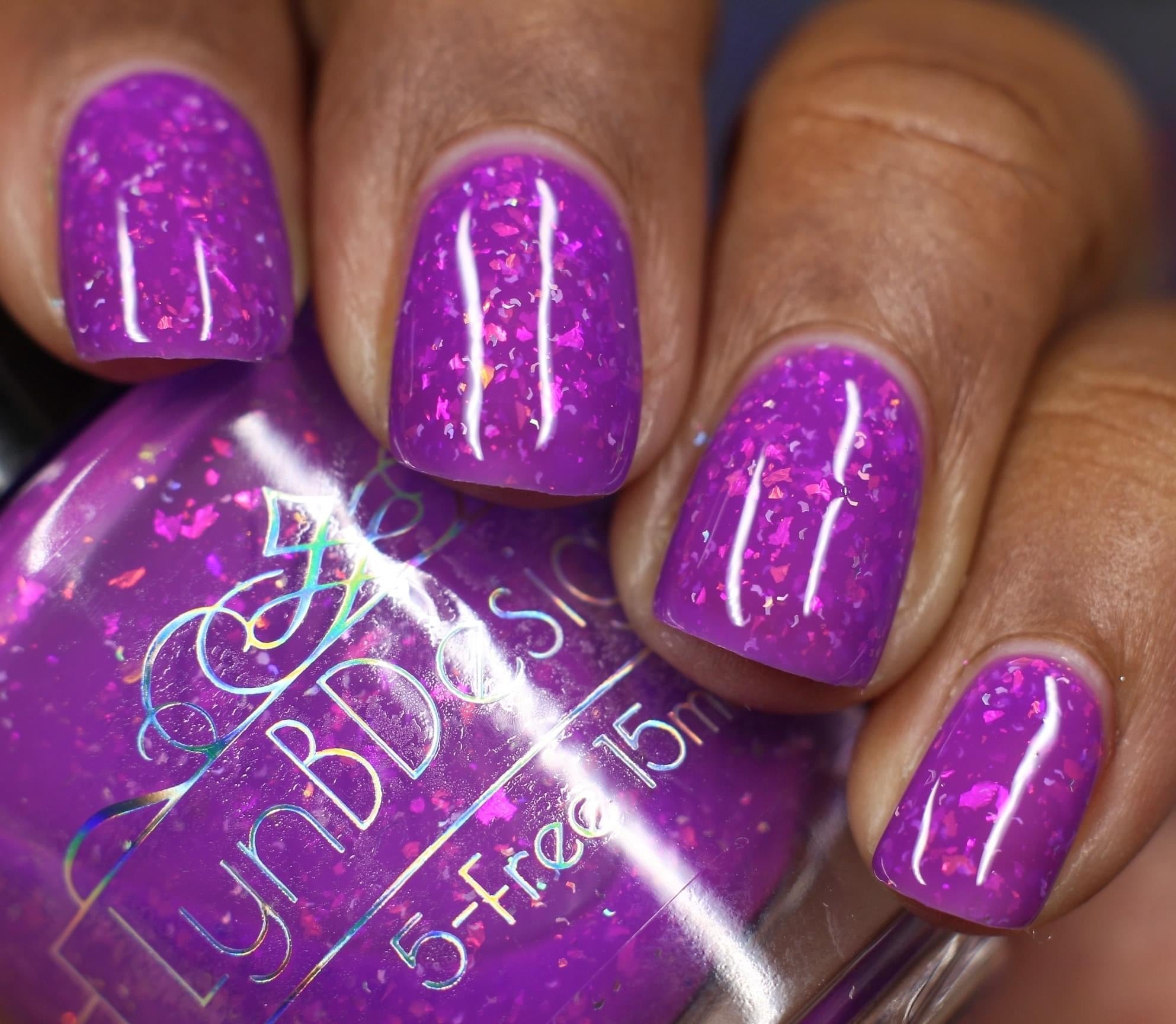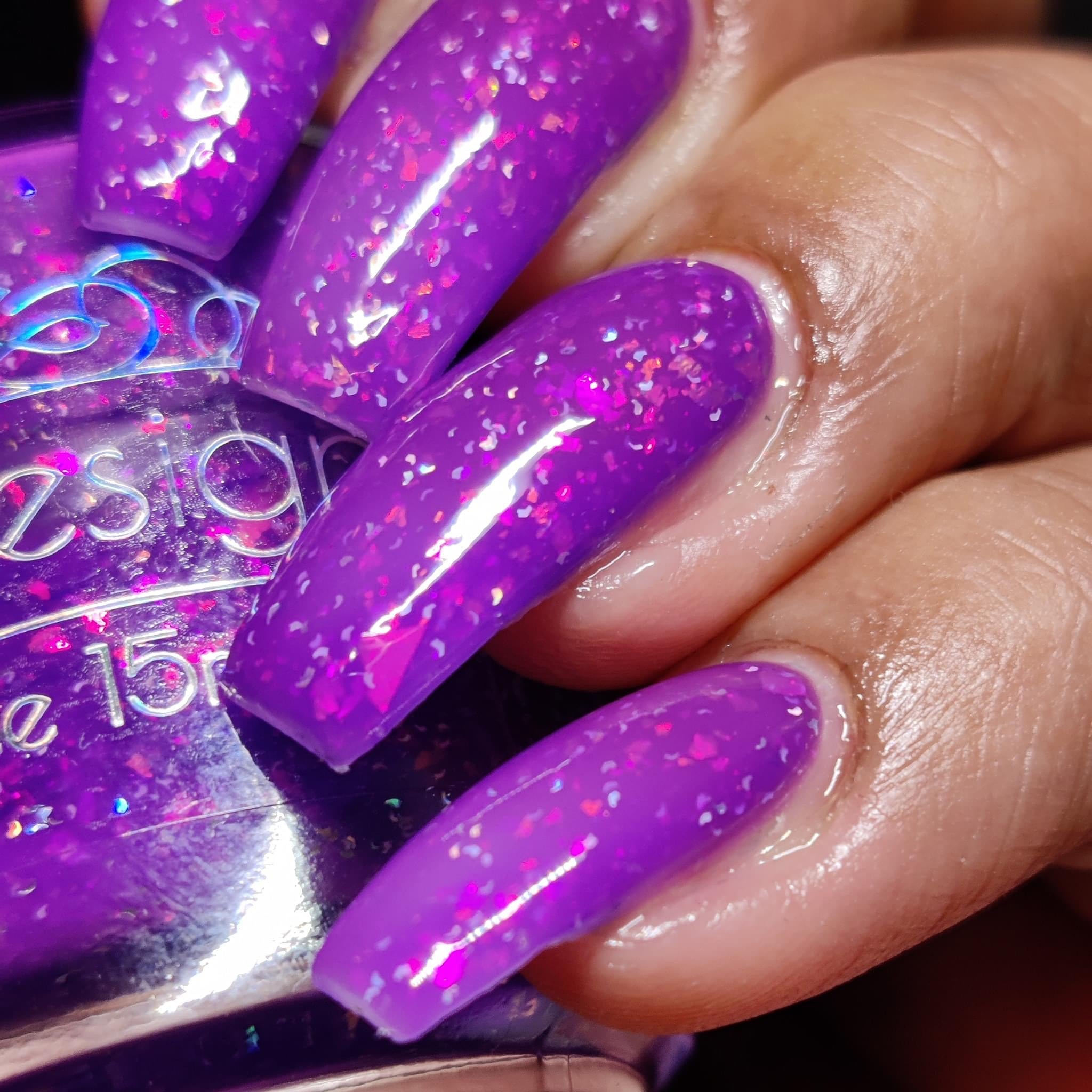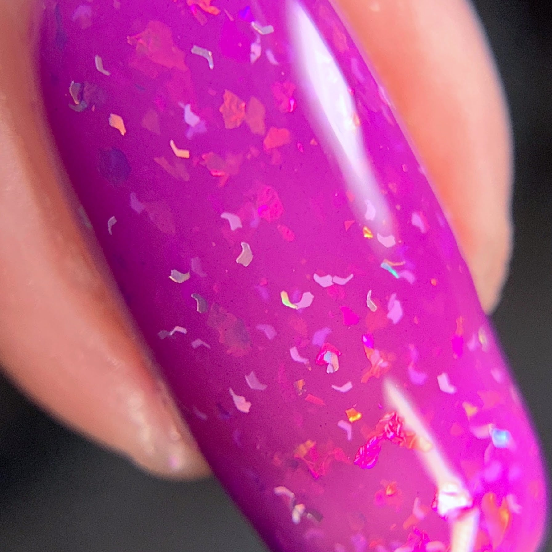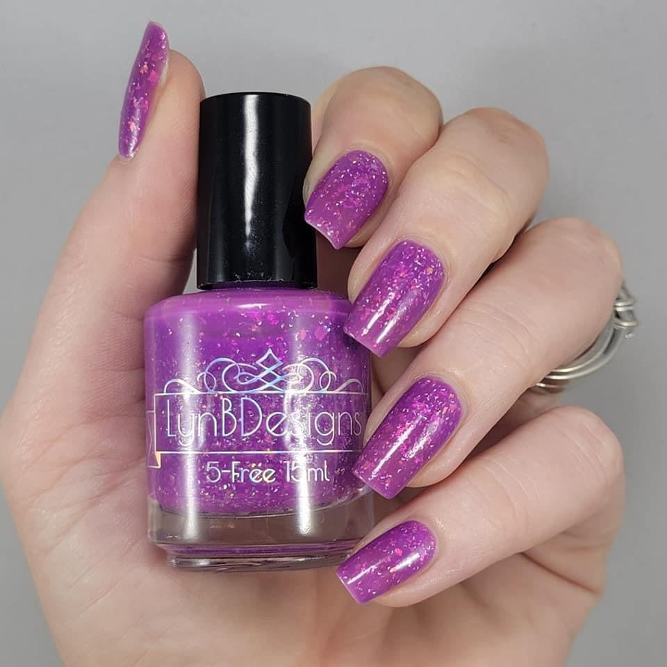 Talk to the Hand- purple jelly base filled with red to orange to yellow shifting flakies and a touch of holo sparkle