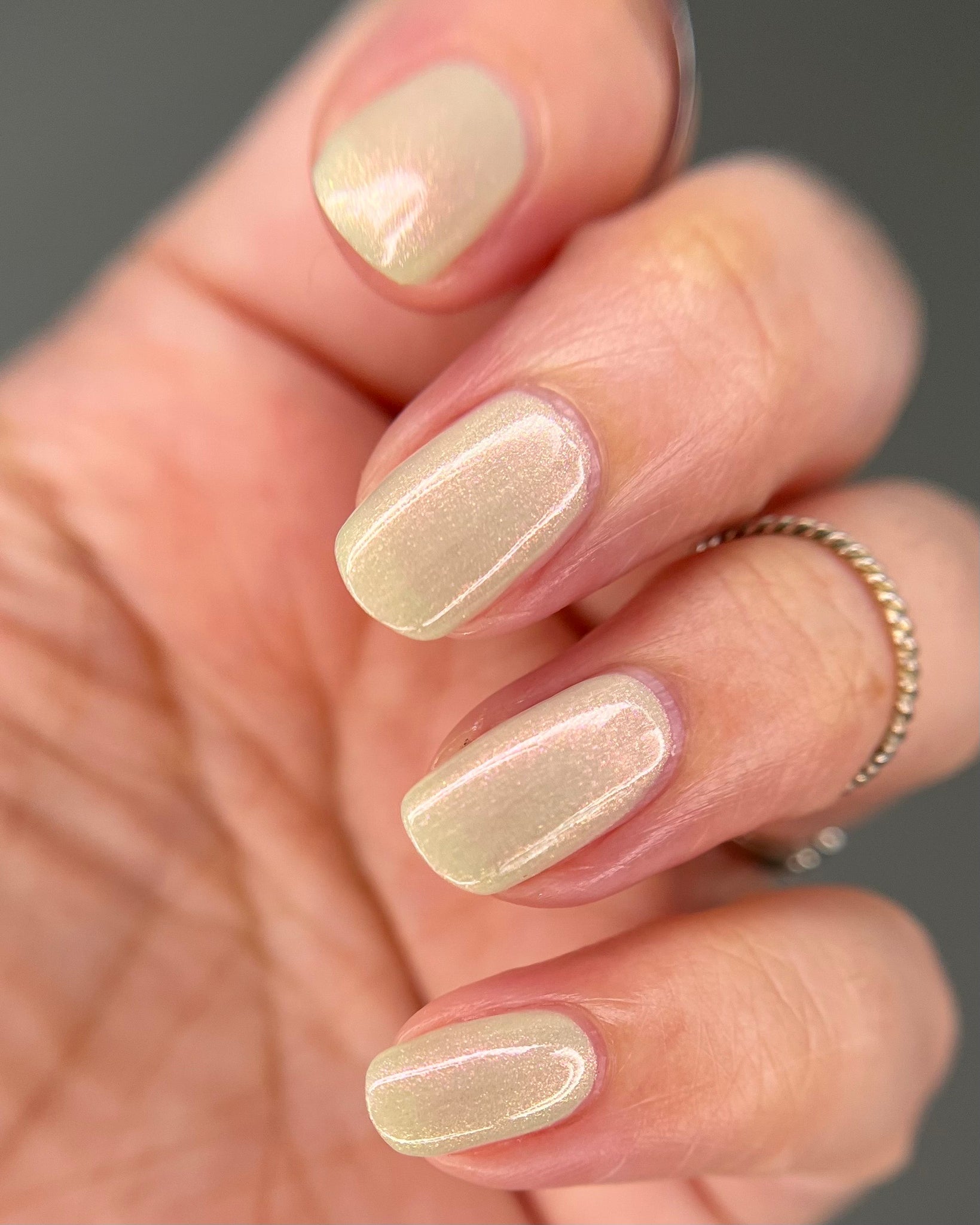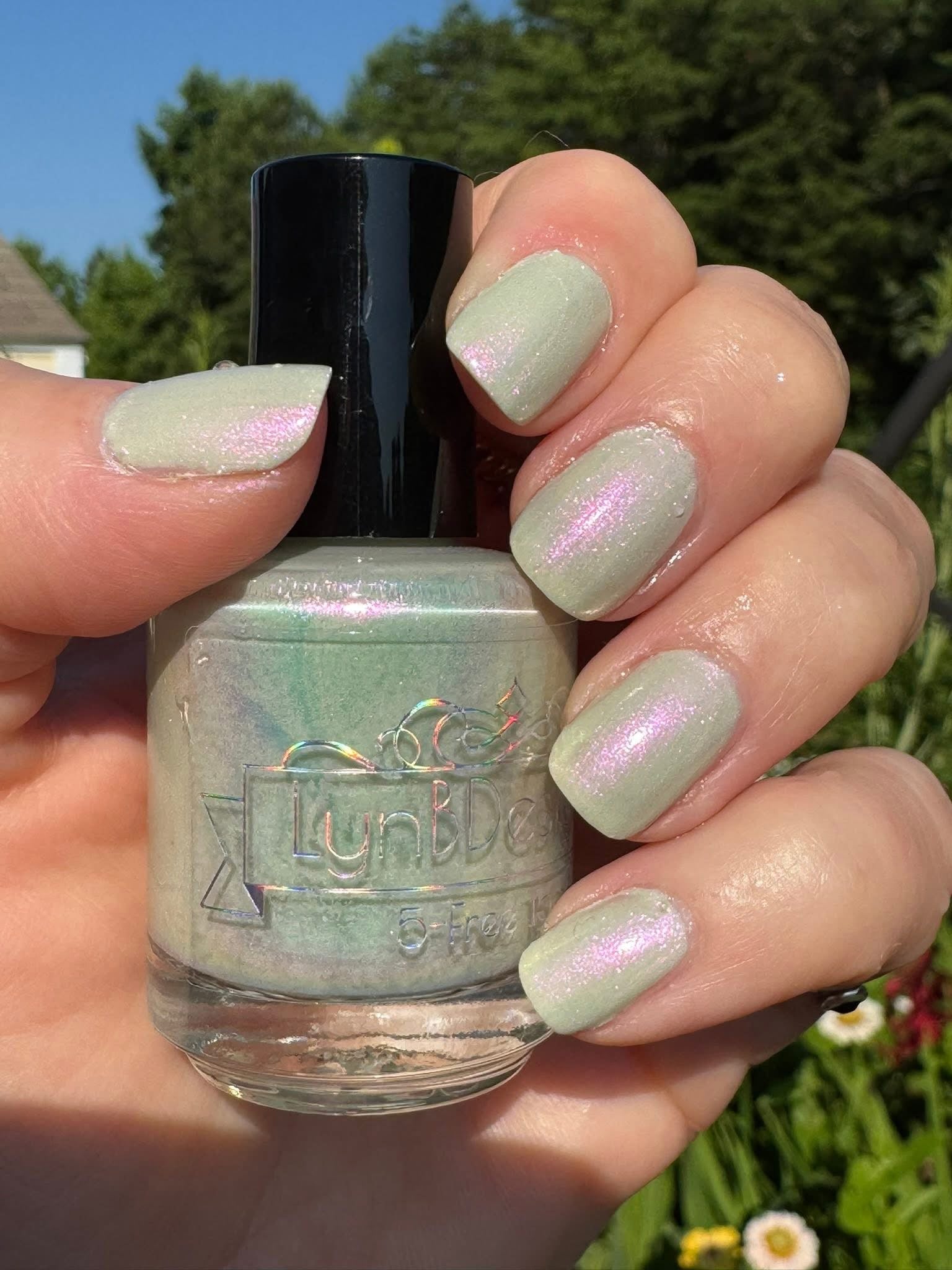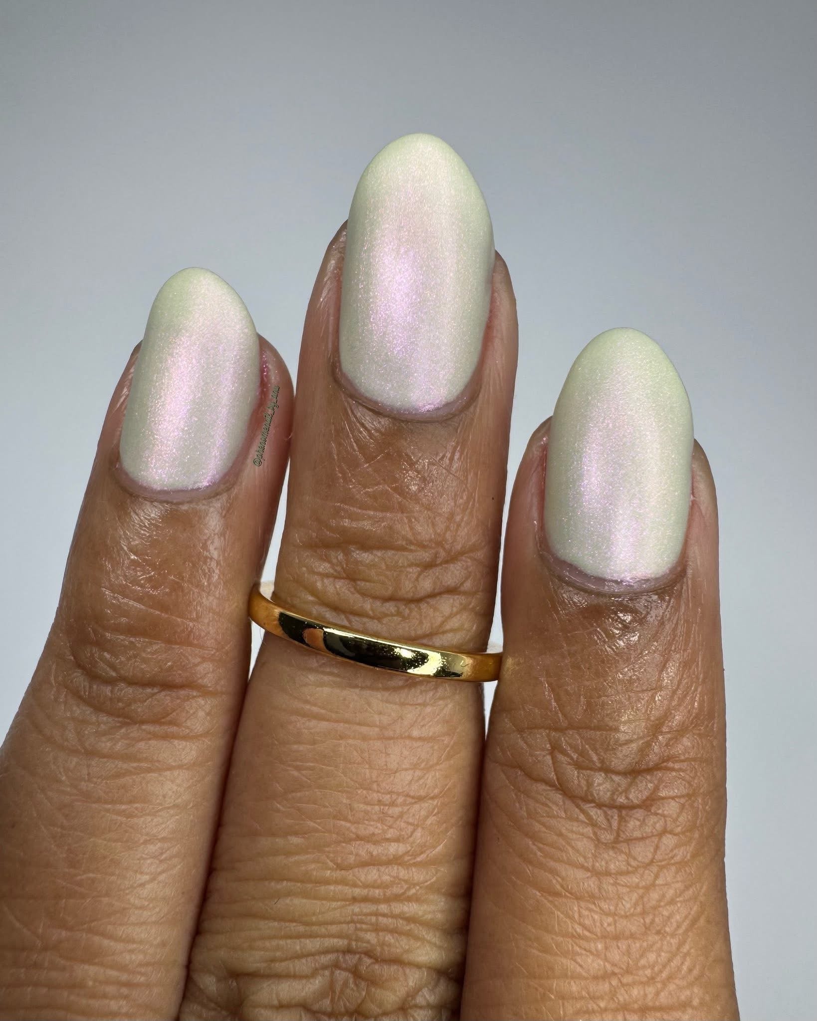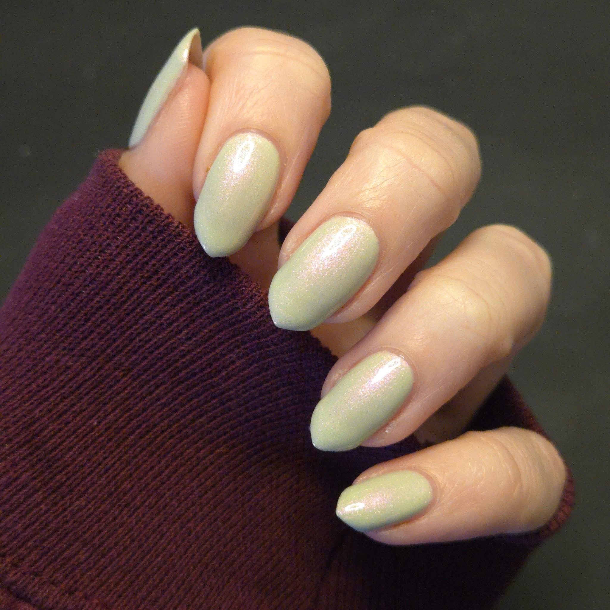 Igneous is Bliss- pale sage green base with peach to orange to green shifting shimmer